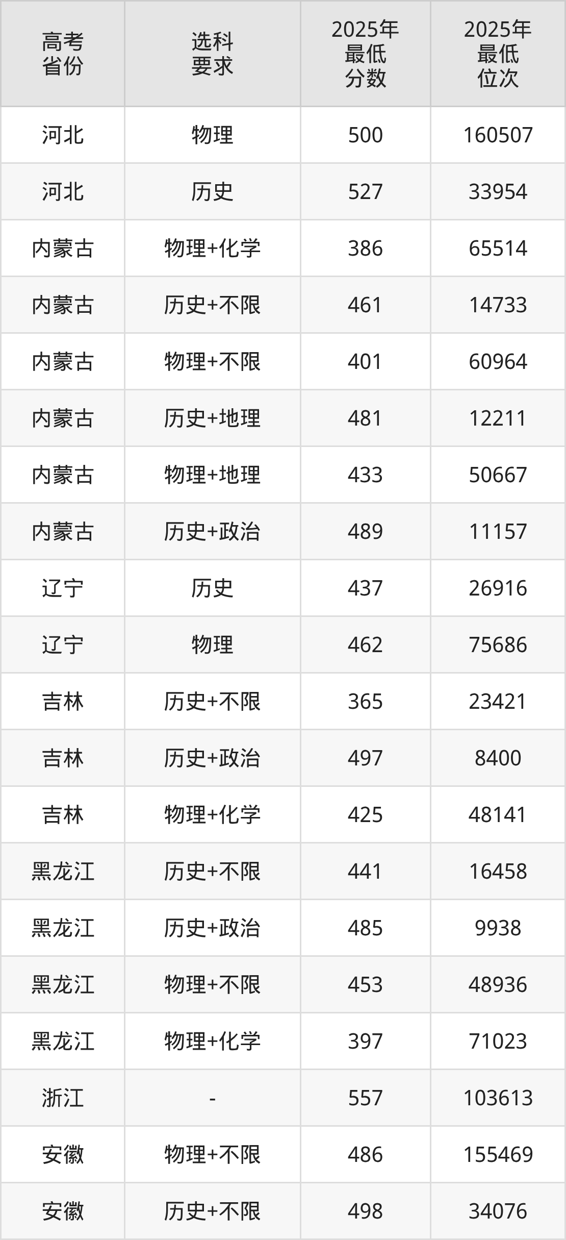 在2025年内蒙古高考物理类招生时,211收分最低的是东北林业大学第006组(中外合作),最低分是499分、位次是30054位。再看呼伦贝尔学院,2025年在内蒙古物理类的最低录取分数线是386分,最低位次是65514位。