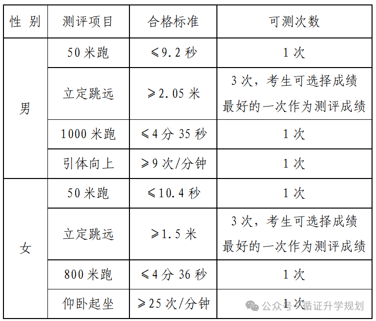 体能测评包括4个项目,合格标准为3项及以上达标。具体标准如下: