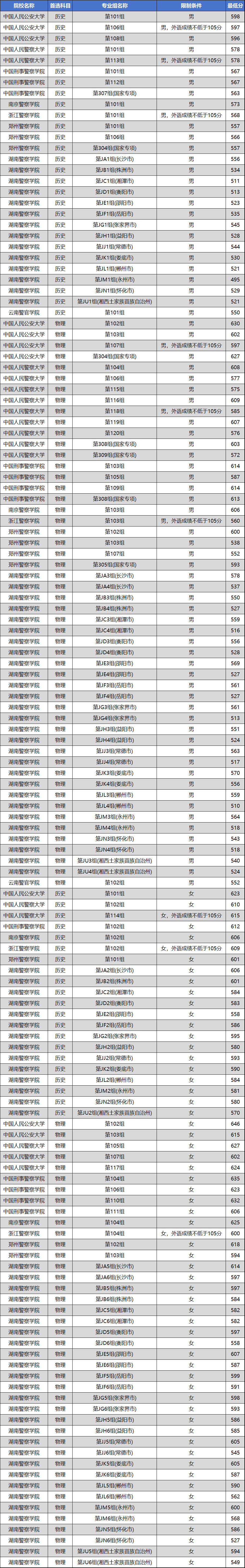 女生录取分数同样保持高位。中国人民公安大学最低分为615分,湖南警察学院各市州女生组最低分在527-614分之间。
