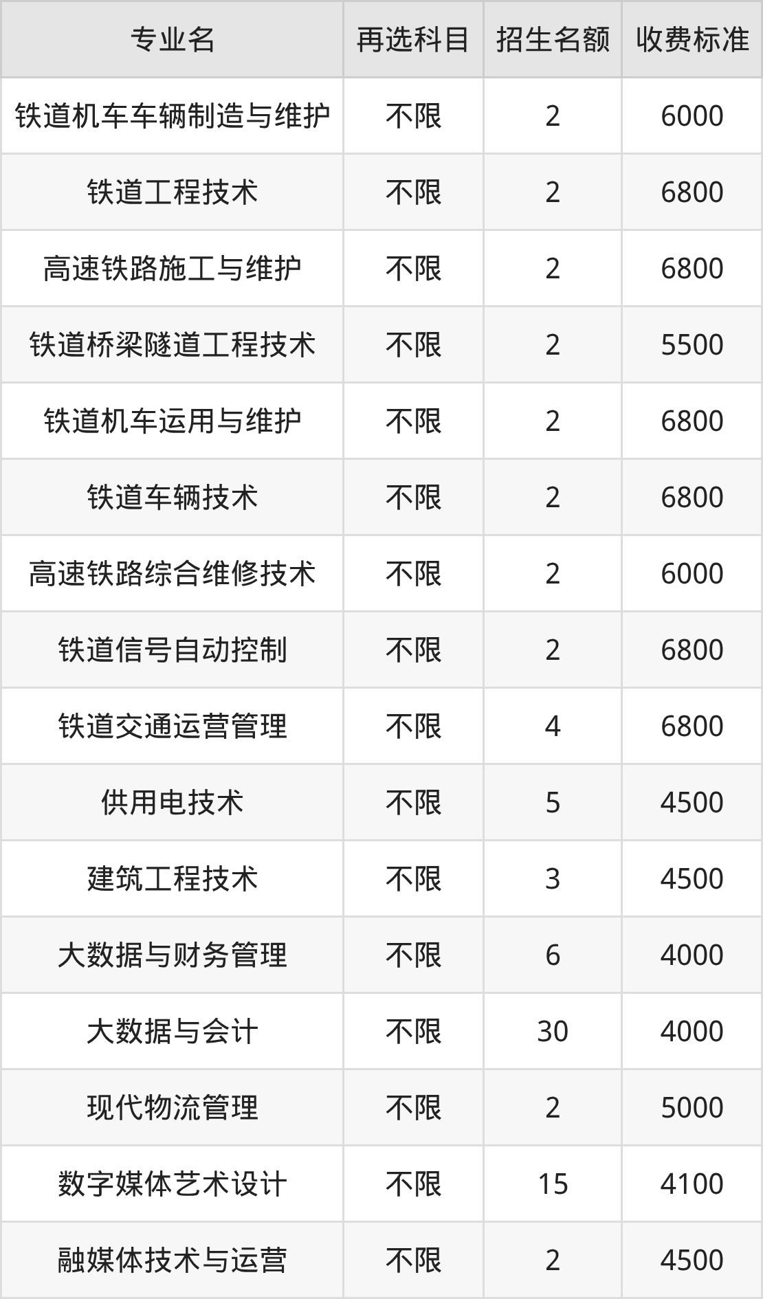 吉林铁道职业技术大学在历史组专科高职批招生的各个专业,每年的学费是4000元-6800元。招生人数最多的专业是大数据与会计,2025年招30人,学费是4000元。