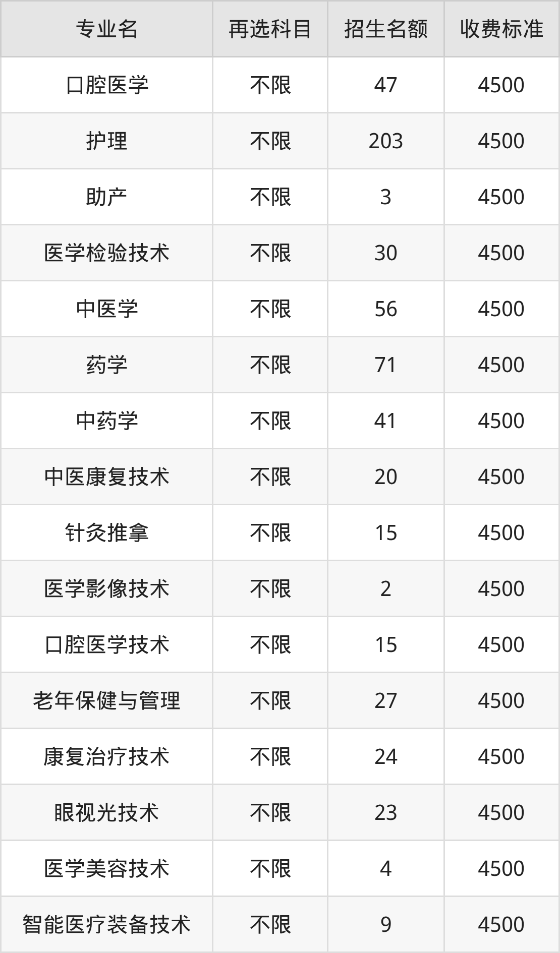 甘肃卫生职业学院在历史组高职专科批招生的各个专业,每年的学费是4500元。招生人数最多的专业是护理,2025年招203人,学费是4500元。