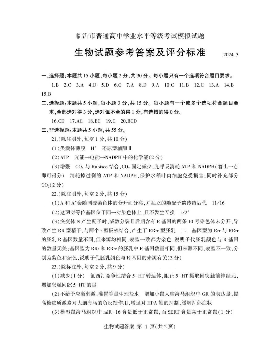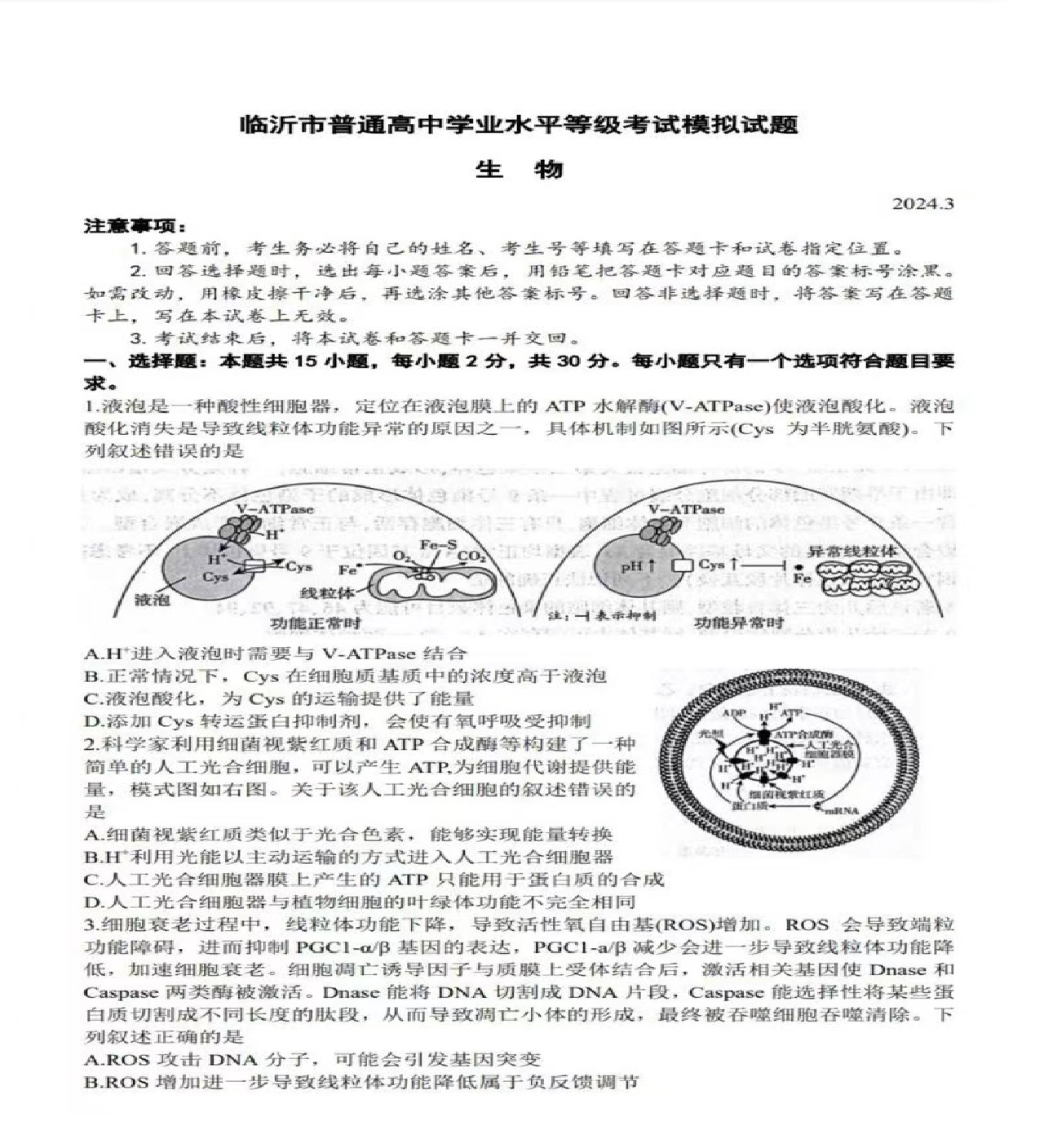 临沂一模生物考试时间:3月6日上午8:00-9:30