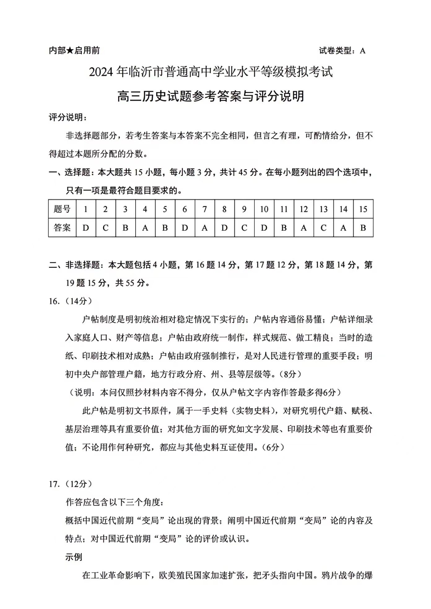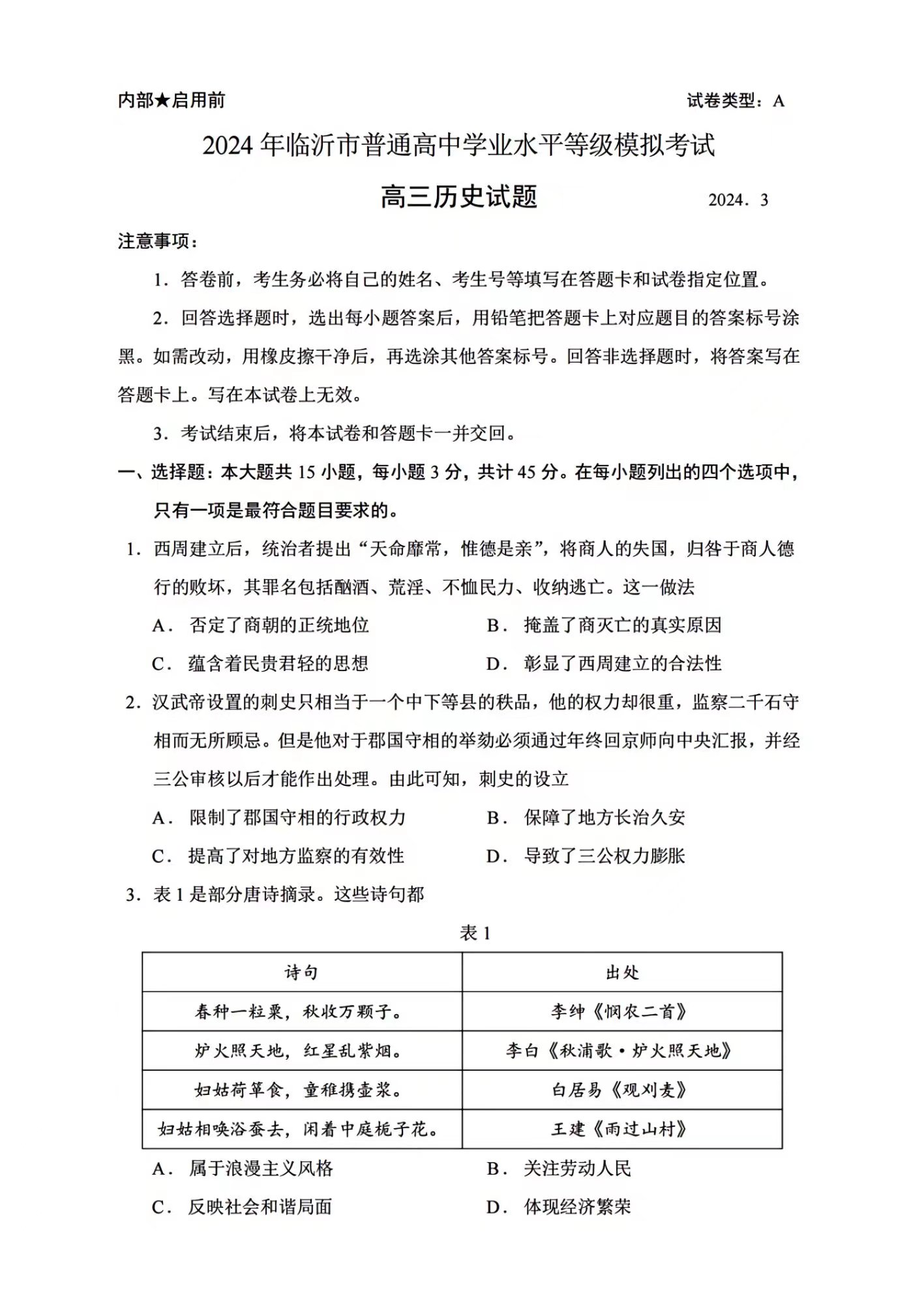 临沂一模历史考试时间:3月5日上午10:00-11:30