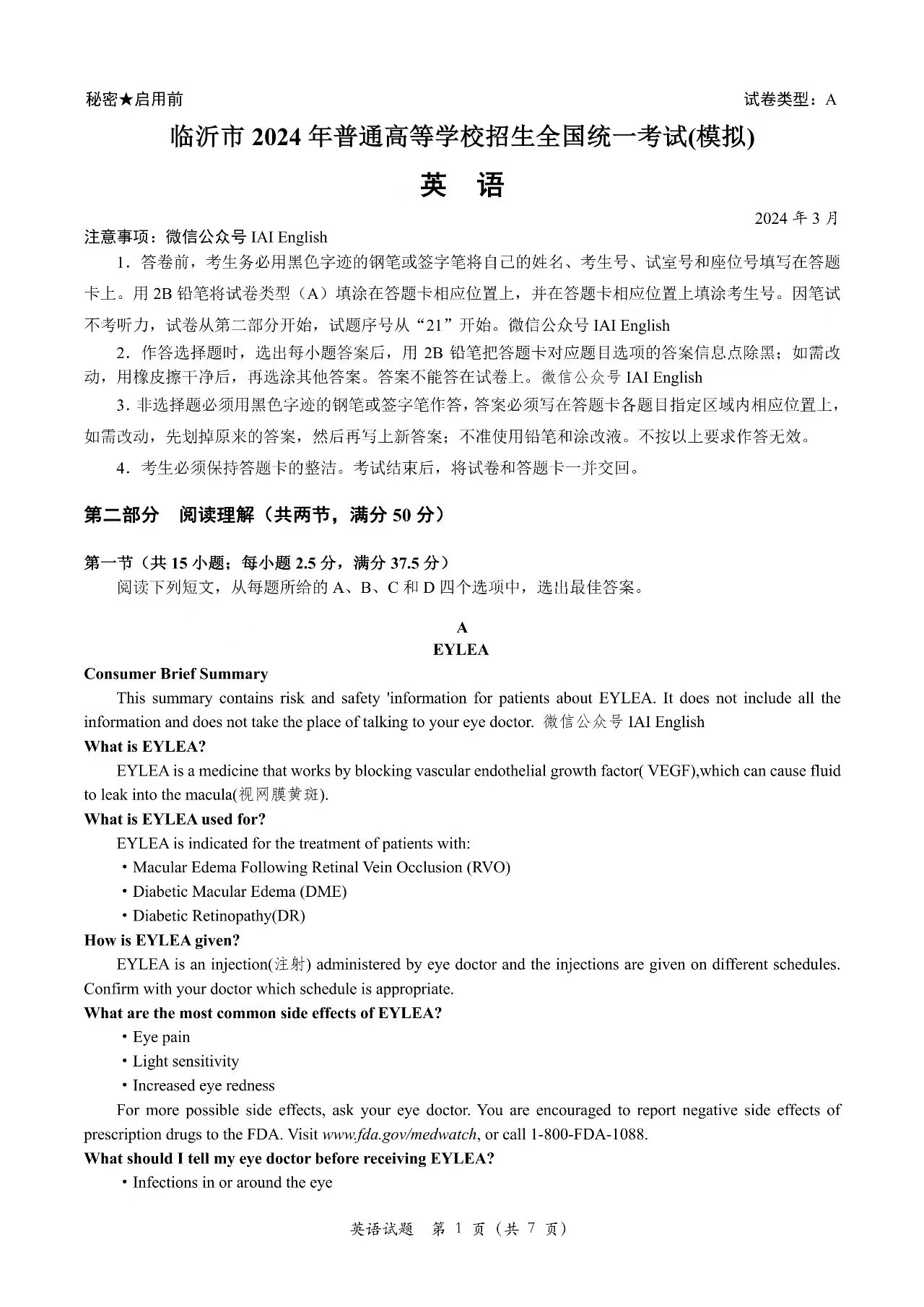 临沂一模英语考试时间:3月6日下午14:30-16:10
