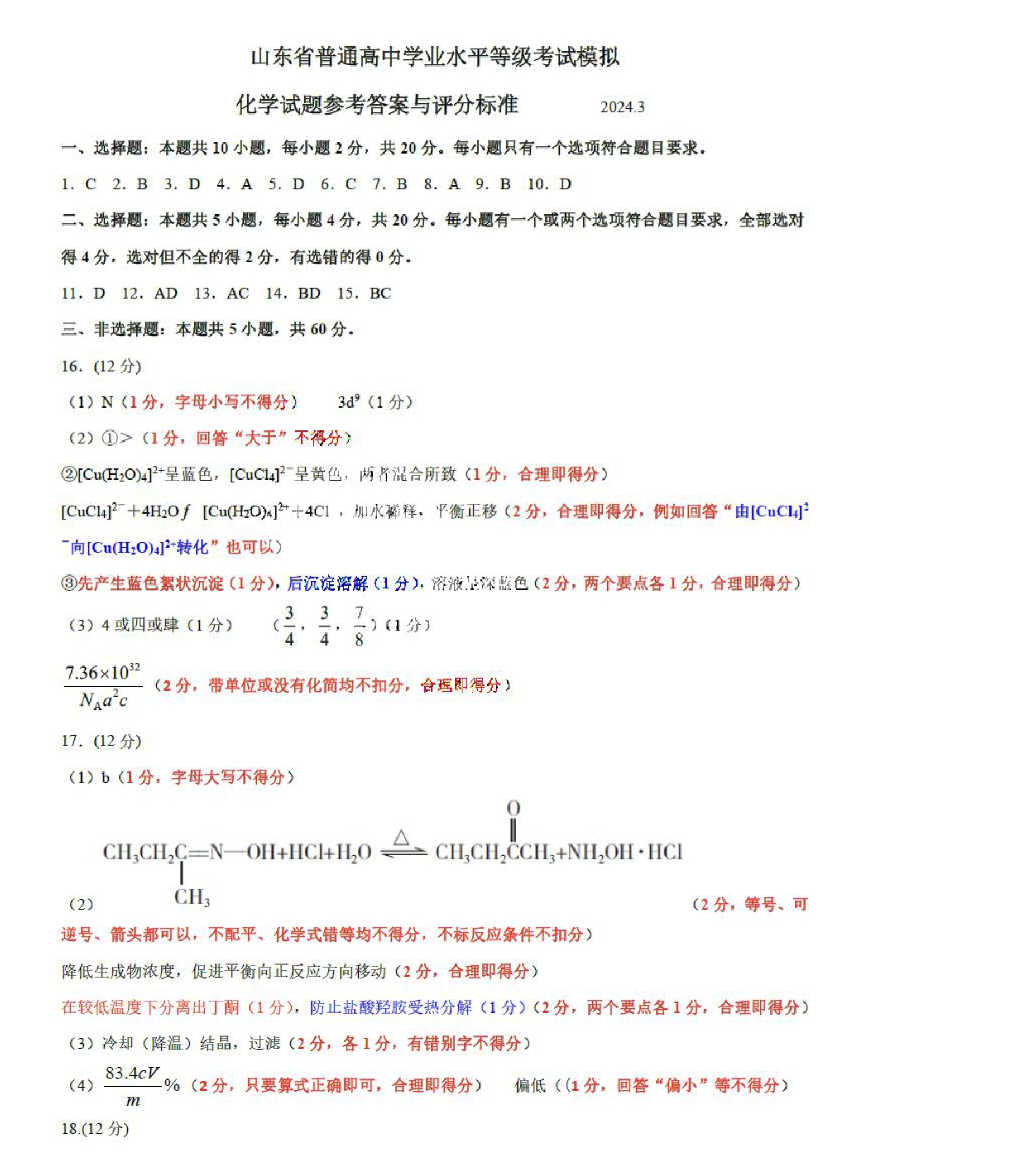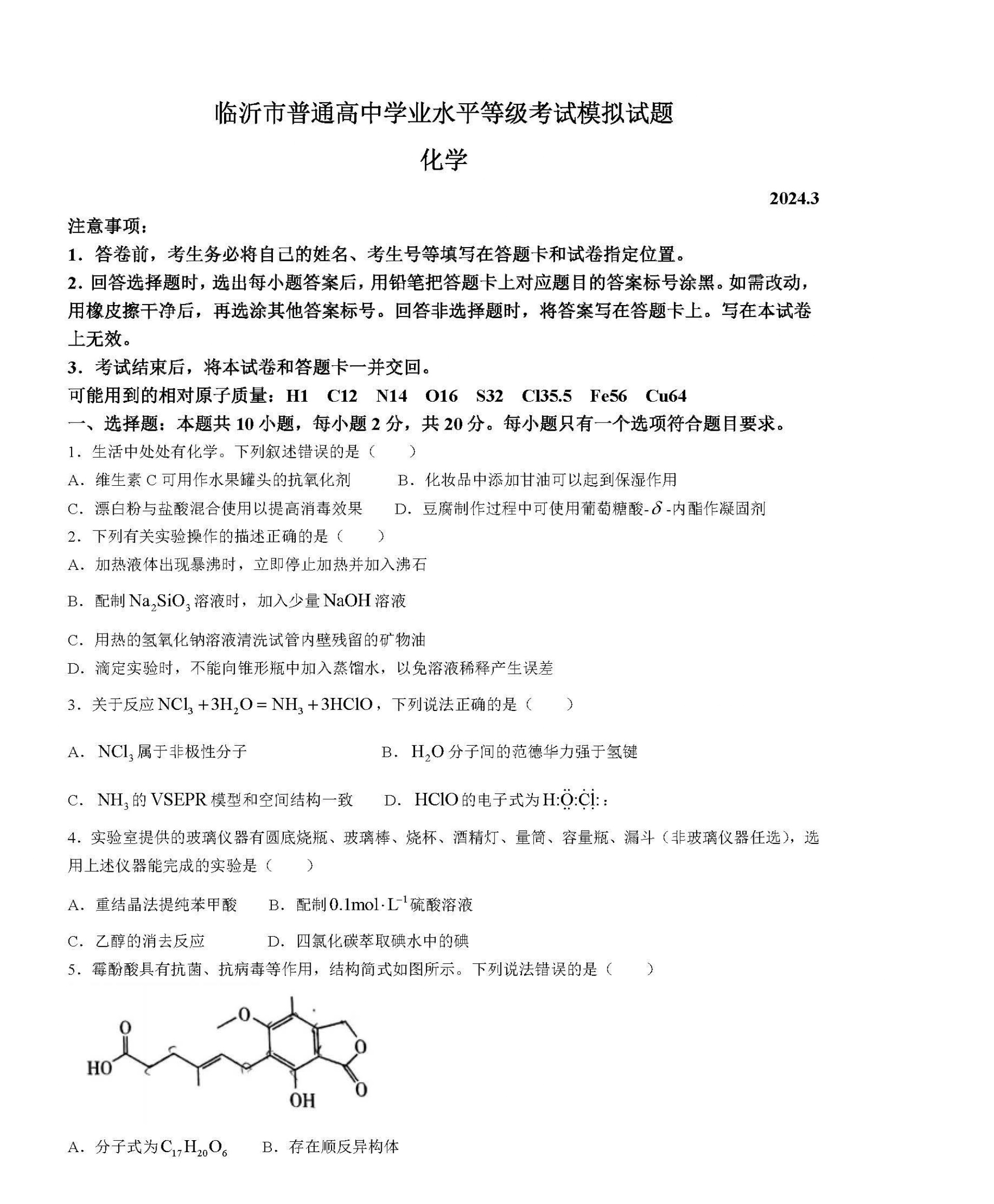 临沂一模化学考试时间:3月5日上午8:00-9:30