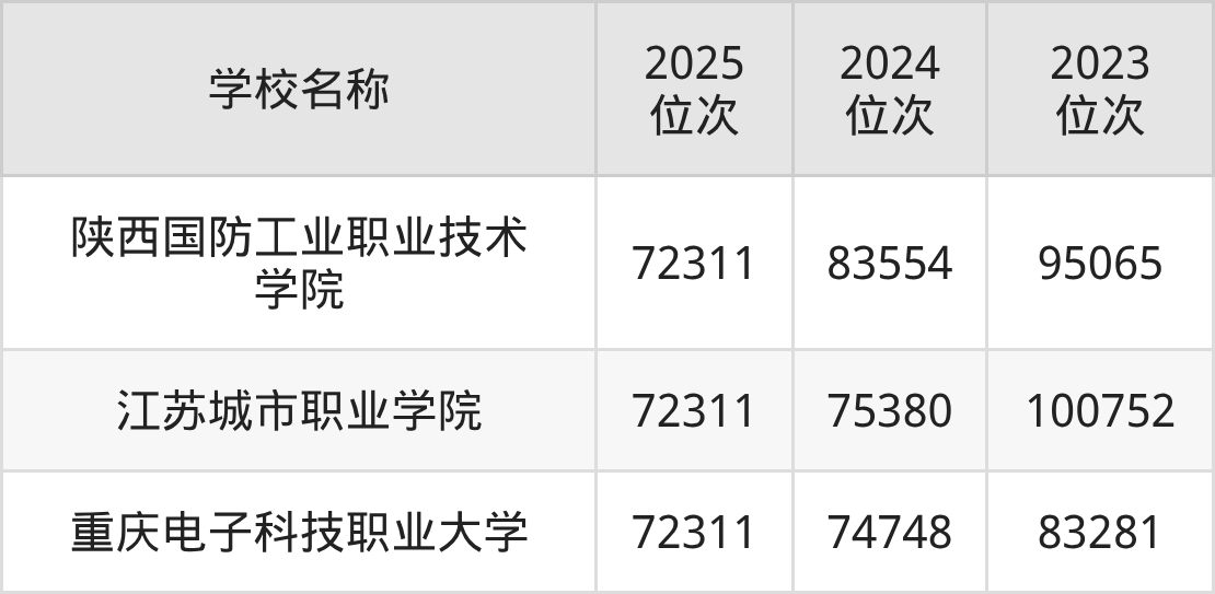 陕西国防工业职业技术学院:2025年的最低分位次是72311名,2024年是83554名,2023年是95065名。招生专业包含:工程造价、机械设计与制造、电气自动化技术、电子信息工程技术、计算机应用技术、人工智能技术应用、动漫制作技术、大数据与会计。