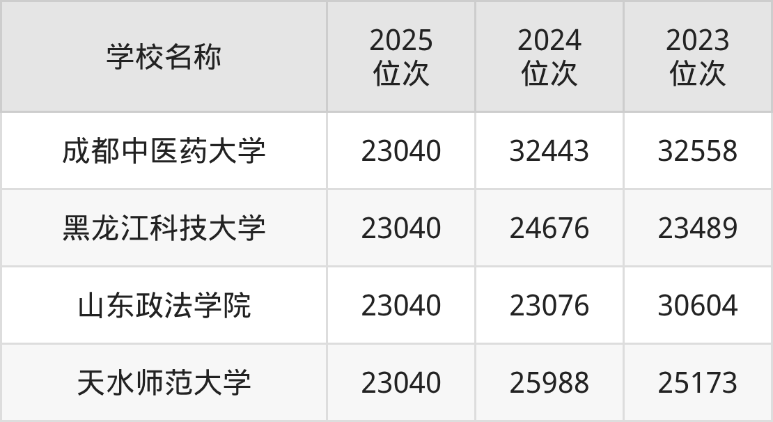 保底的大学:是从“较稳妥”院校中筛选近三年最低录取位次均稳定在23000名之后的院校,录取安全性高,可规避滑档风险。包含成都中医药大学、黑龙江科技大学、山东政法学院、天水师范大学。