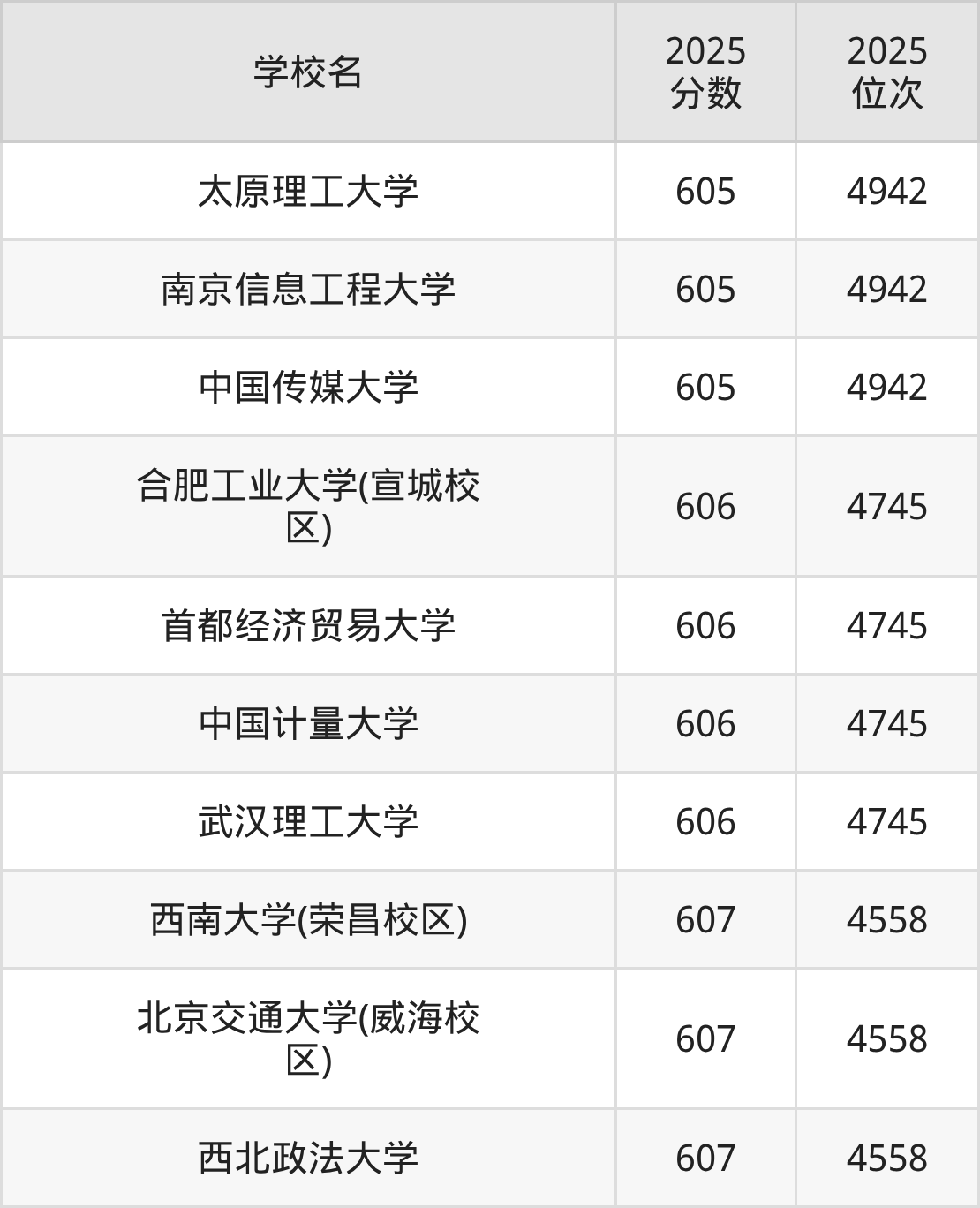 包含:太原理工大学、南京信息工程大学、中国传媒大学、合肥工业大学(宣城校区)、首都经济贸易大学、中国计量大学、武汉理工大学、西南大学(荣昌校区)、北京交通大学(威海校区)、西北政法大学。