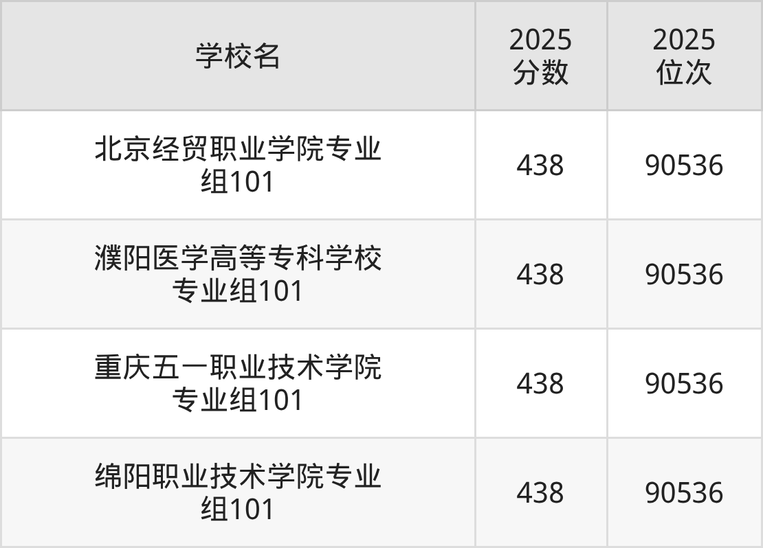 包含:北京经贸职业学院、濮阳医学高等专科学校、重庆五一职业技术学院、绵阳职业技术学院。