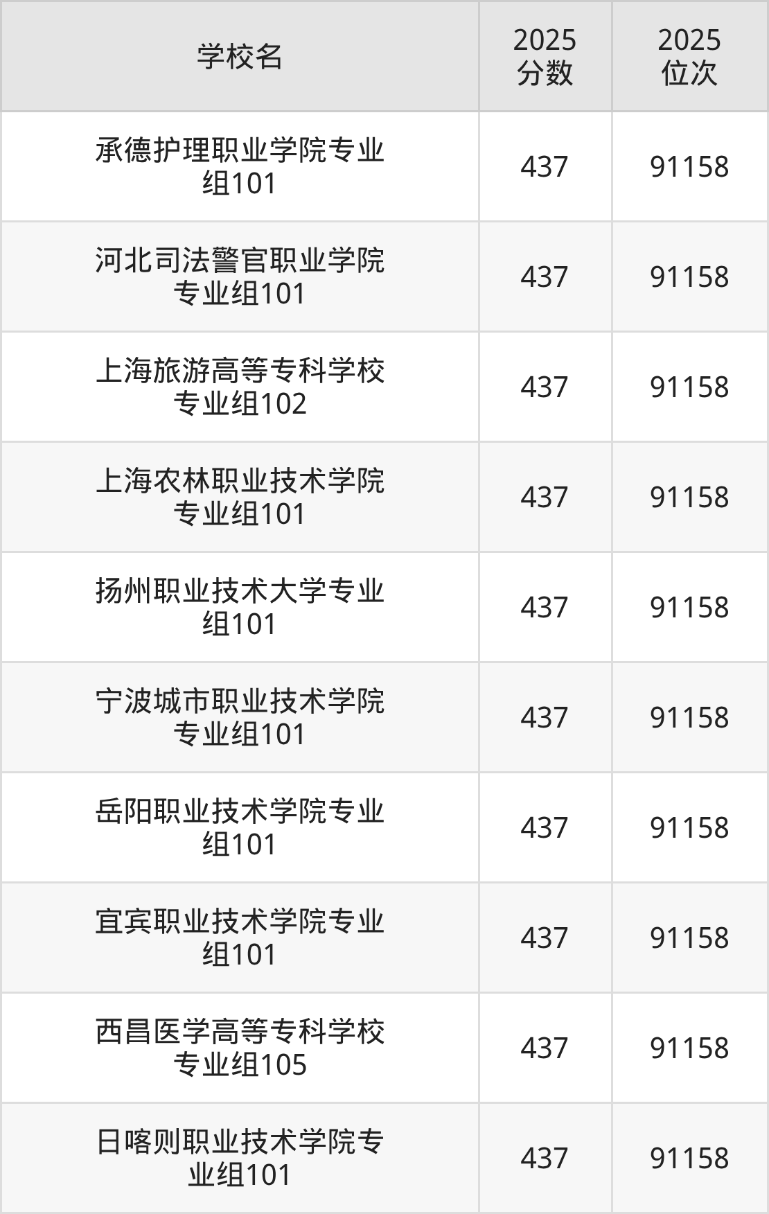 包含:承德护理职业学院、河北司法警官职业学院、上海旅游高等专科学校、上海农林职业技术学院、扬州职业技术大学、宁波城市职业技术学院、岳阳职业技术学院、宜宾职业技术学院、西昌医学高等专科学校、日喀则职业技术学院。