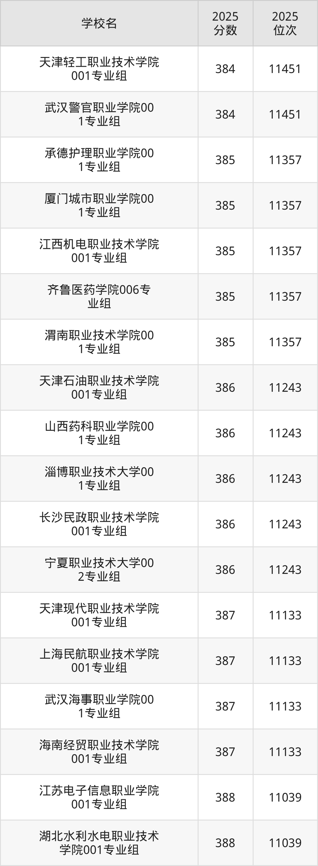 包含:天津轻工职业技术学院、武汉警官职业学院、承德护理职业学院、厦门城市职业学院、江西机电职业技术学院、齐鲁医药学院、渭南职业技术学院、天津石油职业技术学院、山西药科职业学院、淄博职业技术大学。