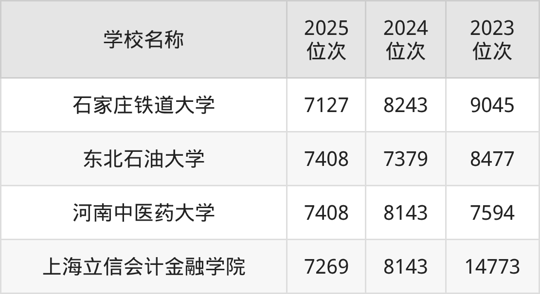 | 学校名称 | 2025 位次 | 2024 位次 | 2023 位次 |