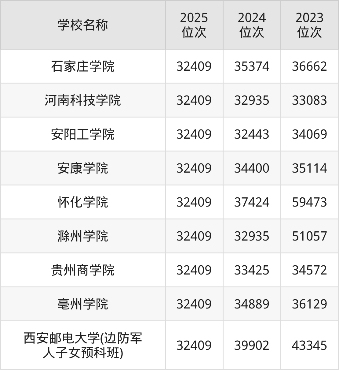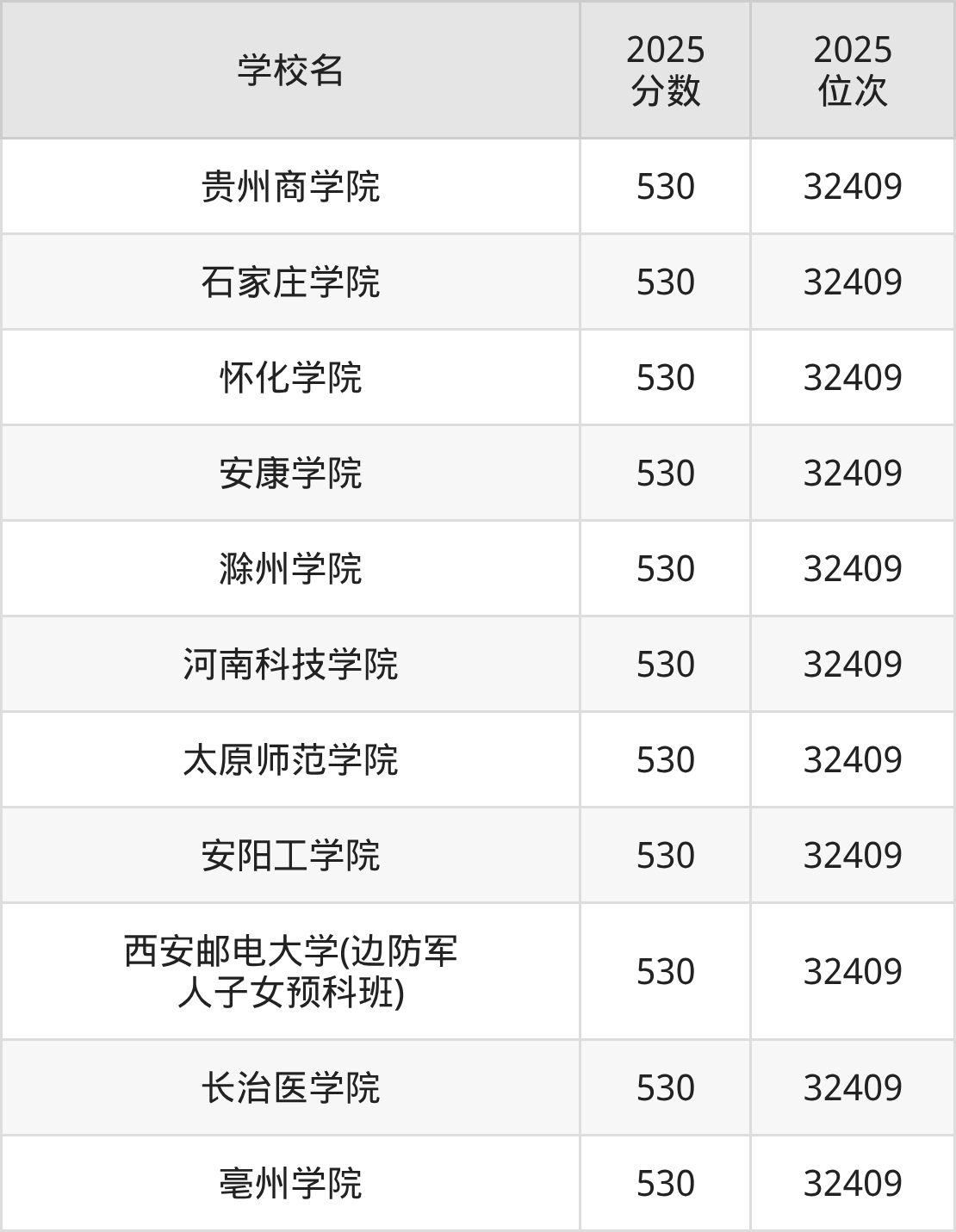 包含:贵州商学院、石家庄学院、怀化学院、安康学院、滁州学院、河南科技学院、太原师范学院、安阳工学院、西安邮电大学(边防军人子女预科班)、长治医学院。
