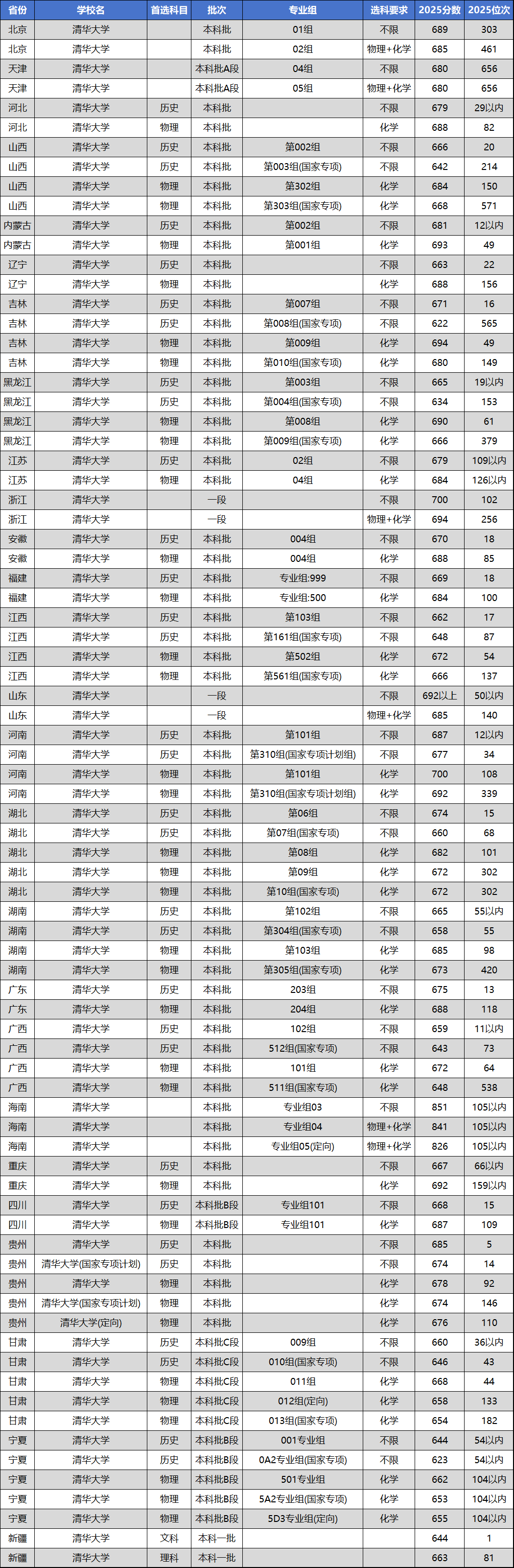 下图为清华大学2025年在各省的最低分情况。从以下数据可知,在湖南、河北、福建、江西等地,考680分都是可以上清华的。其中吉林历史类考生通过国家专项计划报考清华大学最具性价比,622分就能考上。