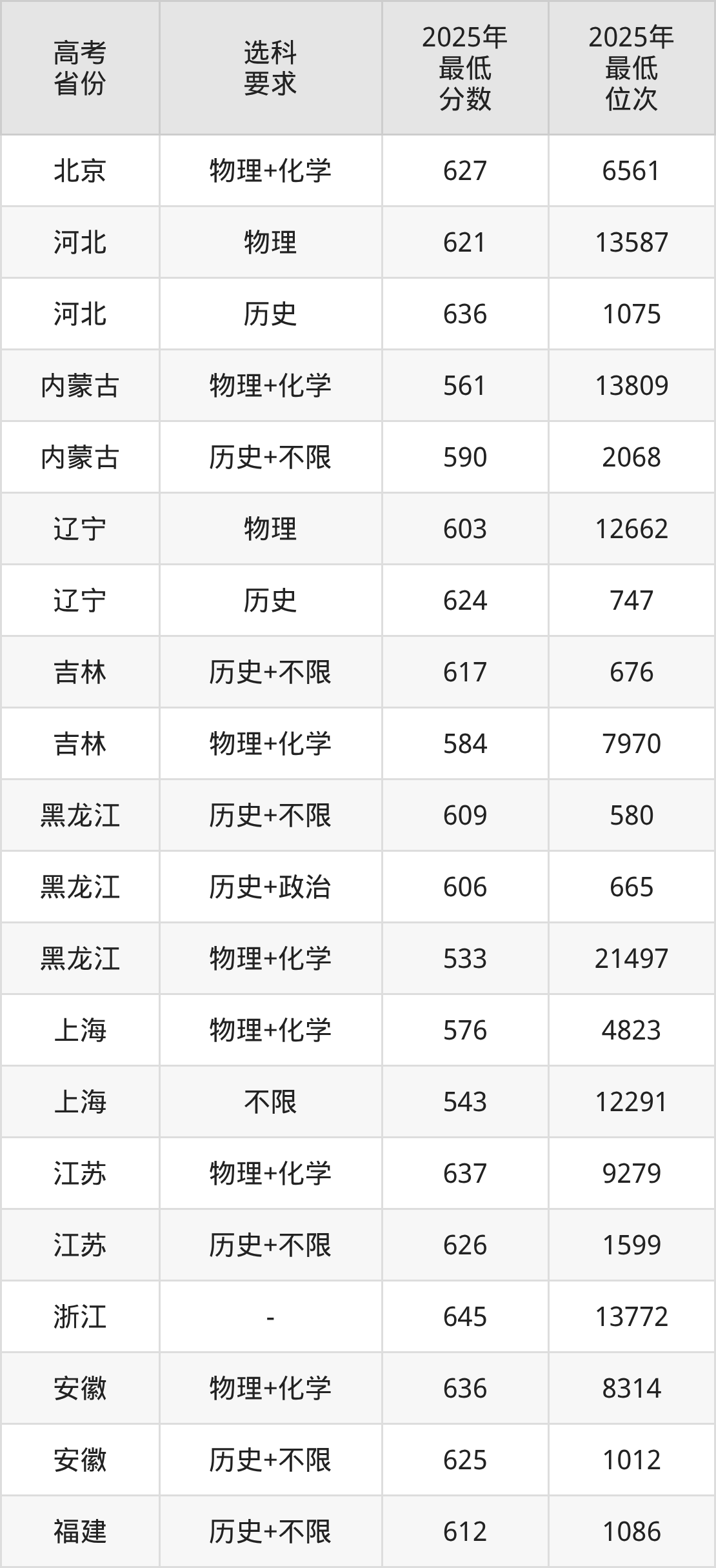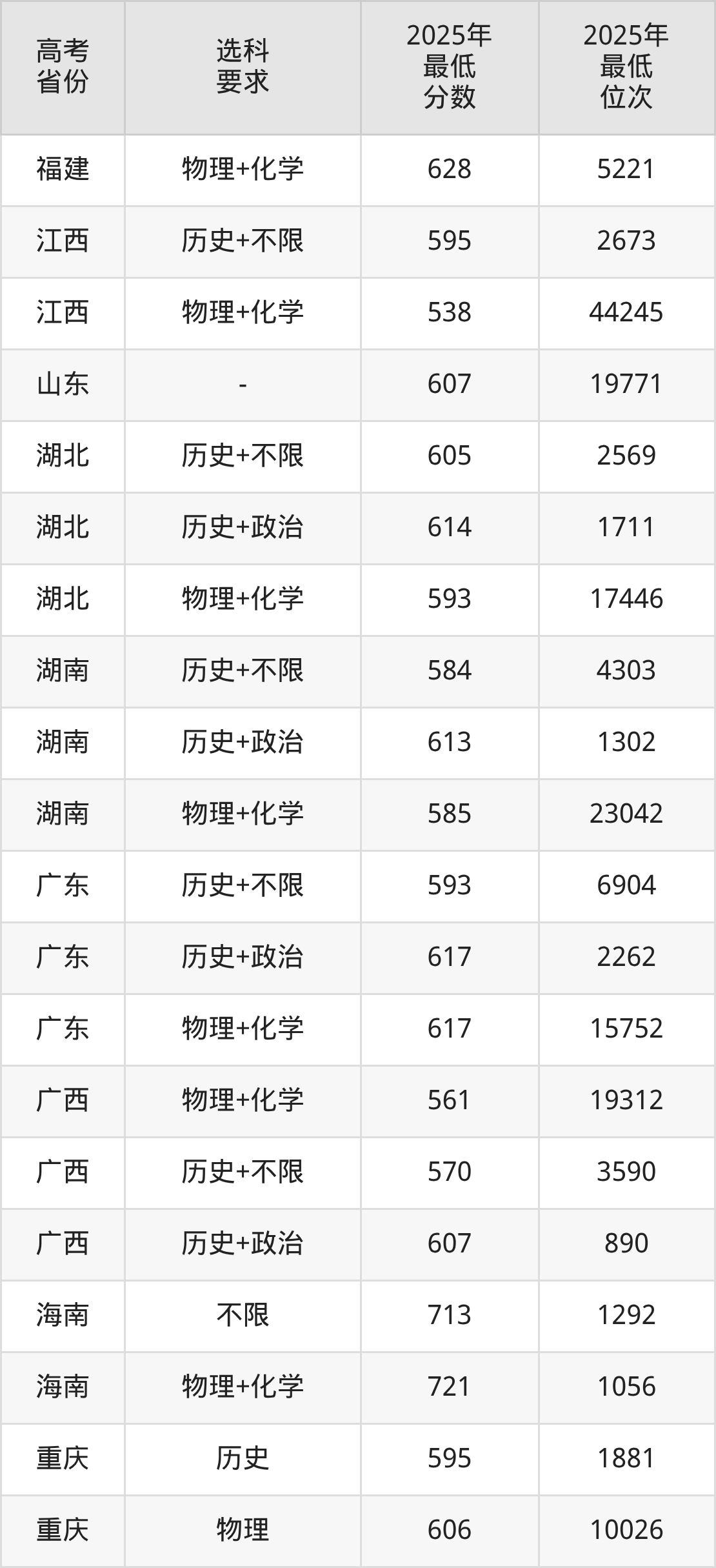 在2025年重庆高考物理类招生时,清华北大收分最低的是清华大学,最低分是692分、位次是159位。再看重庆大学,2025年在重庆物理类的最低录取分数线是606分,最低位次是10026位。
