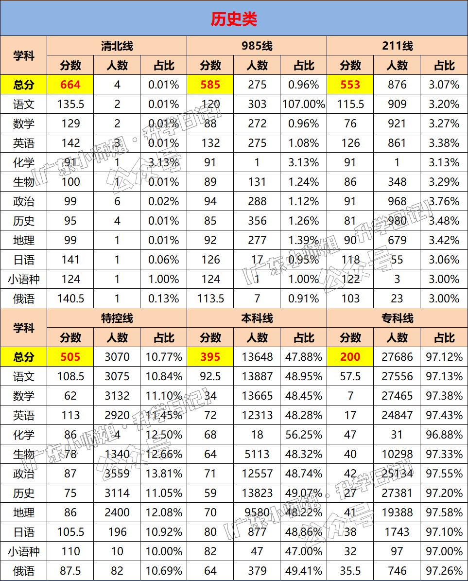 对比来看,在同等层级上,历史类的清北线、985线与特控线分数要求略高于物理类,而211线和本科线则较为接近。这反映了不同选科组合考生成绩的分布特点。