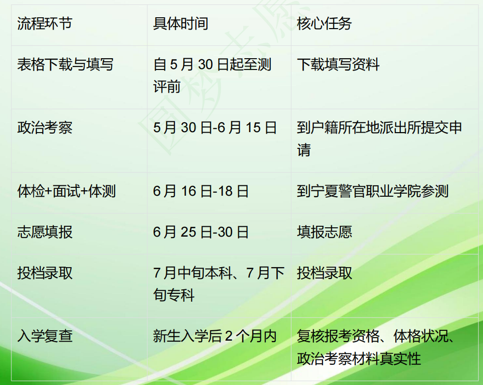 考生需携带已通过审核的《政治考察表》及其他全套材料,前往宁夏警官职业学院(统一测评点)参加面试、体检和体能测评。三项内容连续进行,全部合格方可进入下一环节。