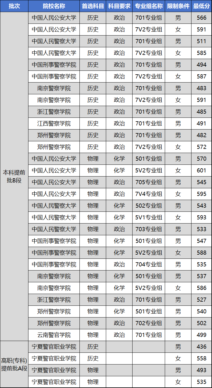公安学类专业(要求政治):分数同样不低,中国人民公安大学女生专业组(政治)最低595分。