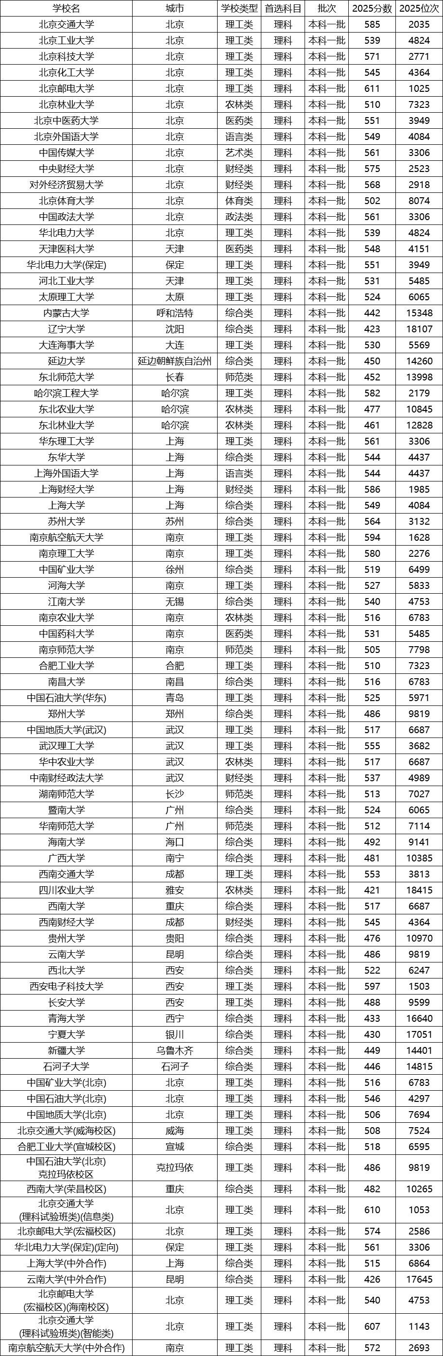 1.新疆大学:2025年理科本科一批投档分为449分,位次14401。作为自治区内唯一的“双一流”综合类大学,学科齐全,适合意向留疆发展的考生。