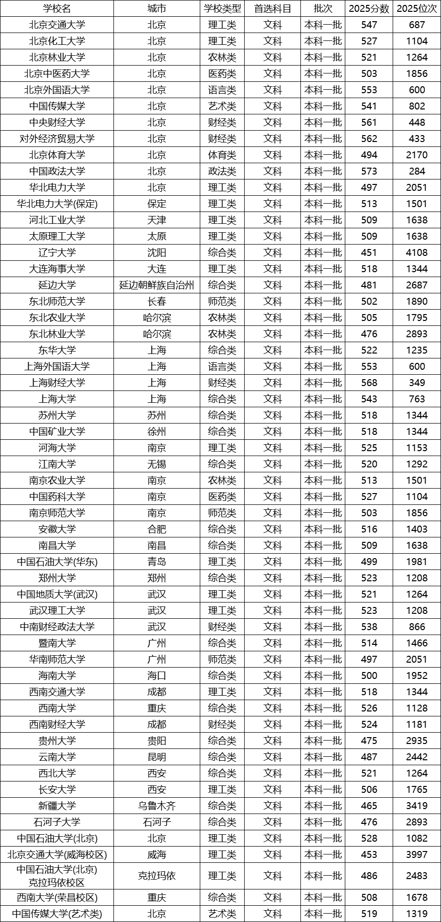 2.中分段(500分-550分):包括北京交通大学(547分)、上海大学(543分)、中南财经政法大学(538分)等。这一区间院校数量最多,涵盖综合、师范、理工类211,是多数文科生的主攻范围。