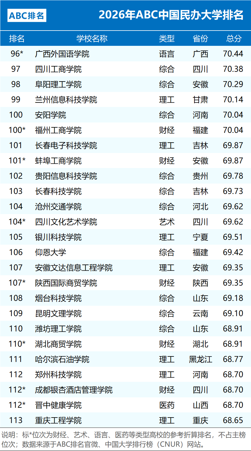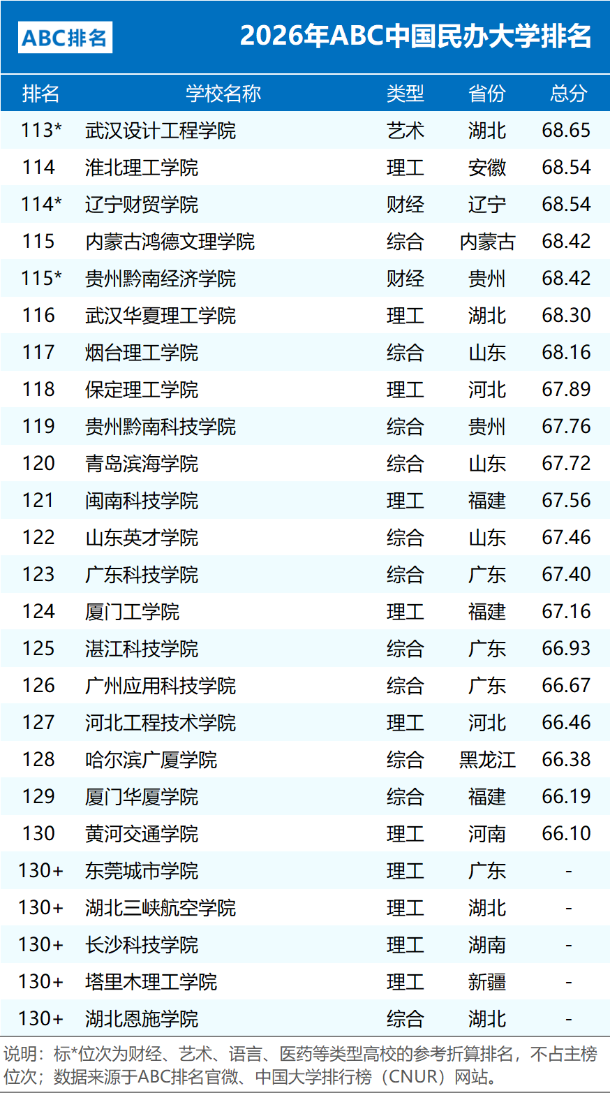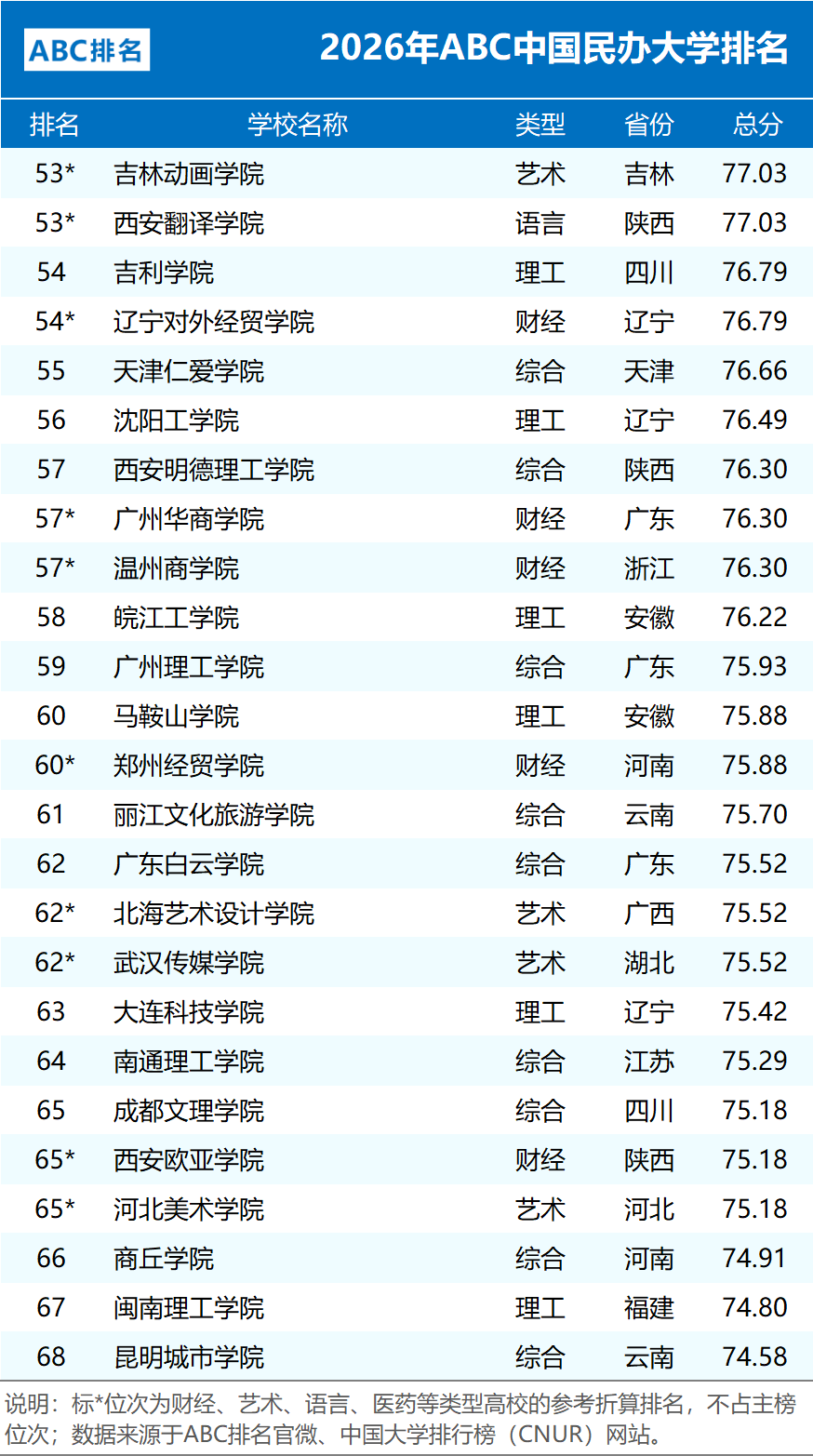 下面我们将分类展示各类院校的完整排名情况。