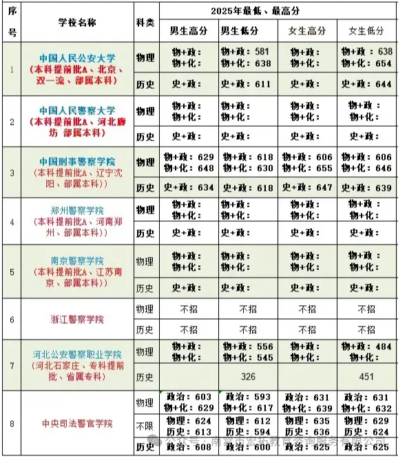 核心观察:公安技术类专业(物化)的录取分数通常保持在高位,女生录取线依然远超男生。