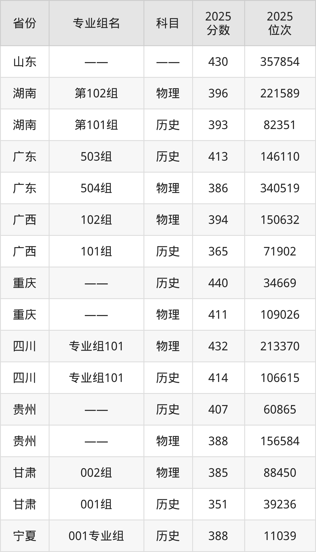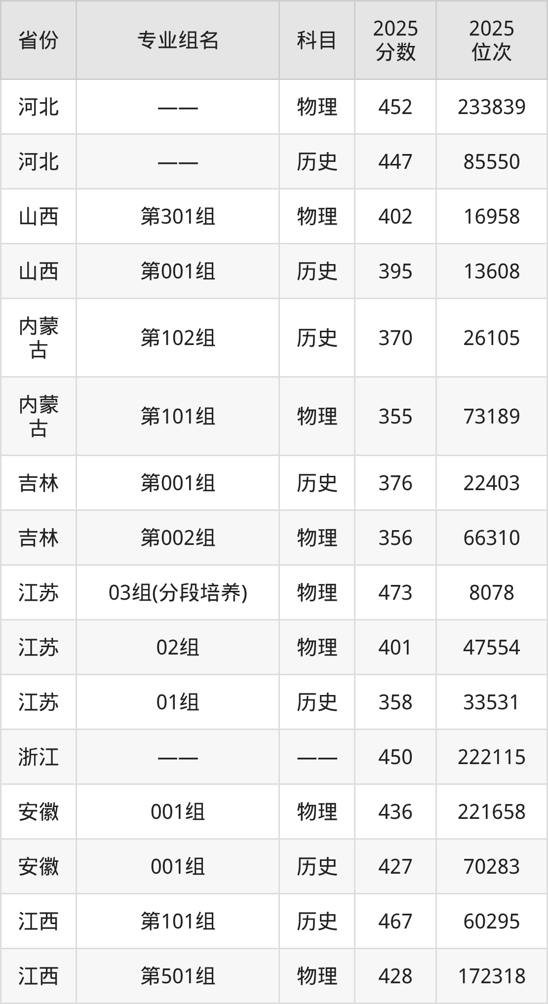 物理类:03组(分段培养) 473分、02组 401分。