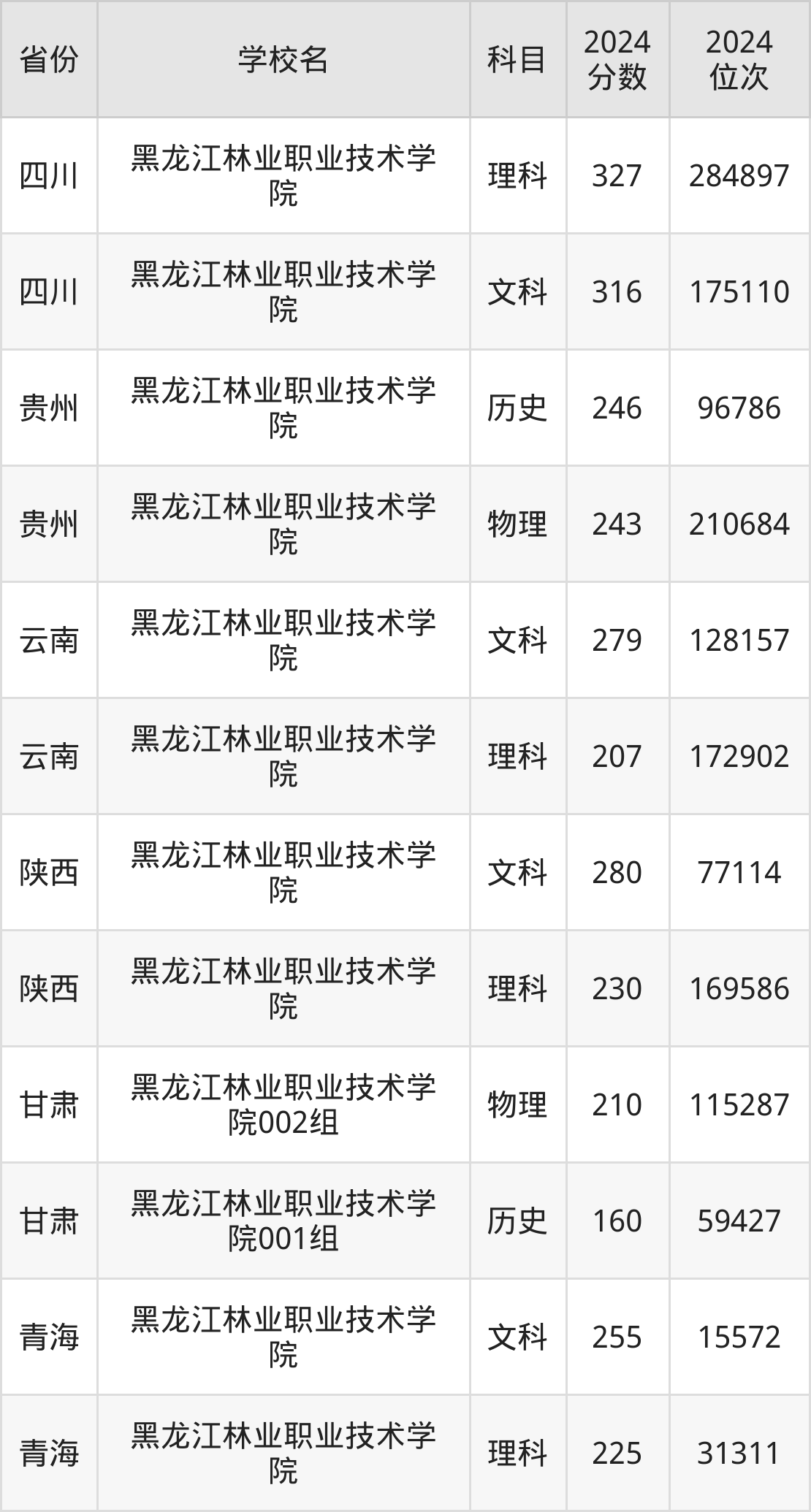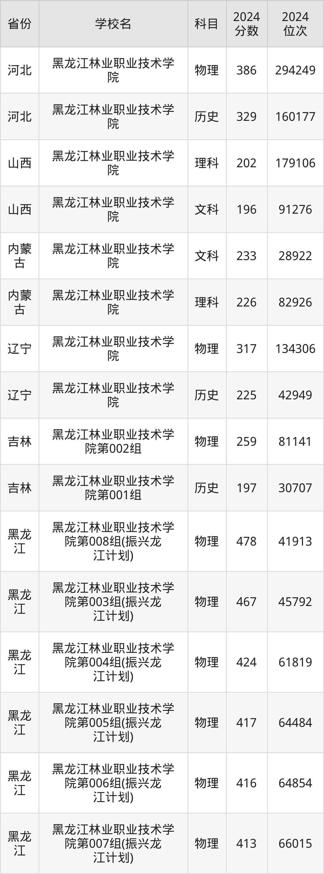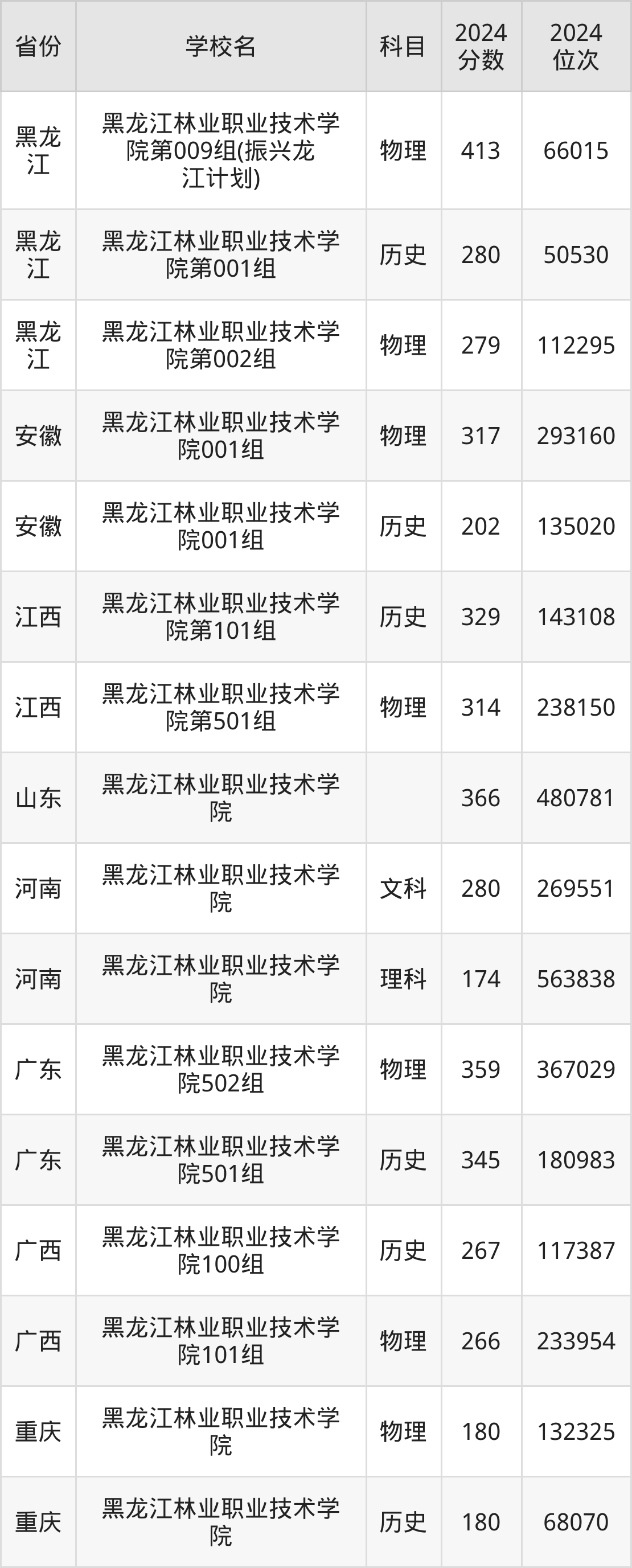下面是黑龙江林业职业技术学院2024年录取分数线一览表: