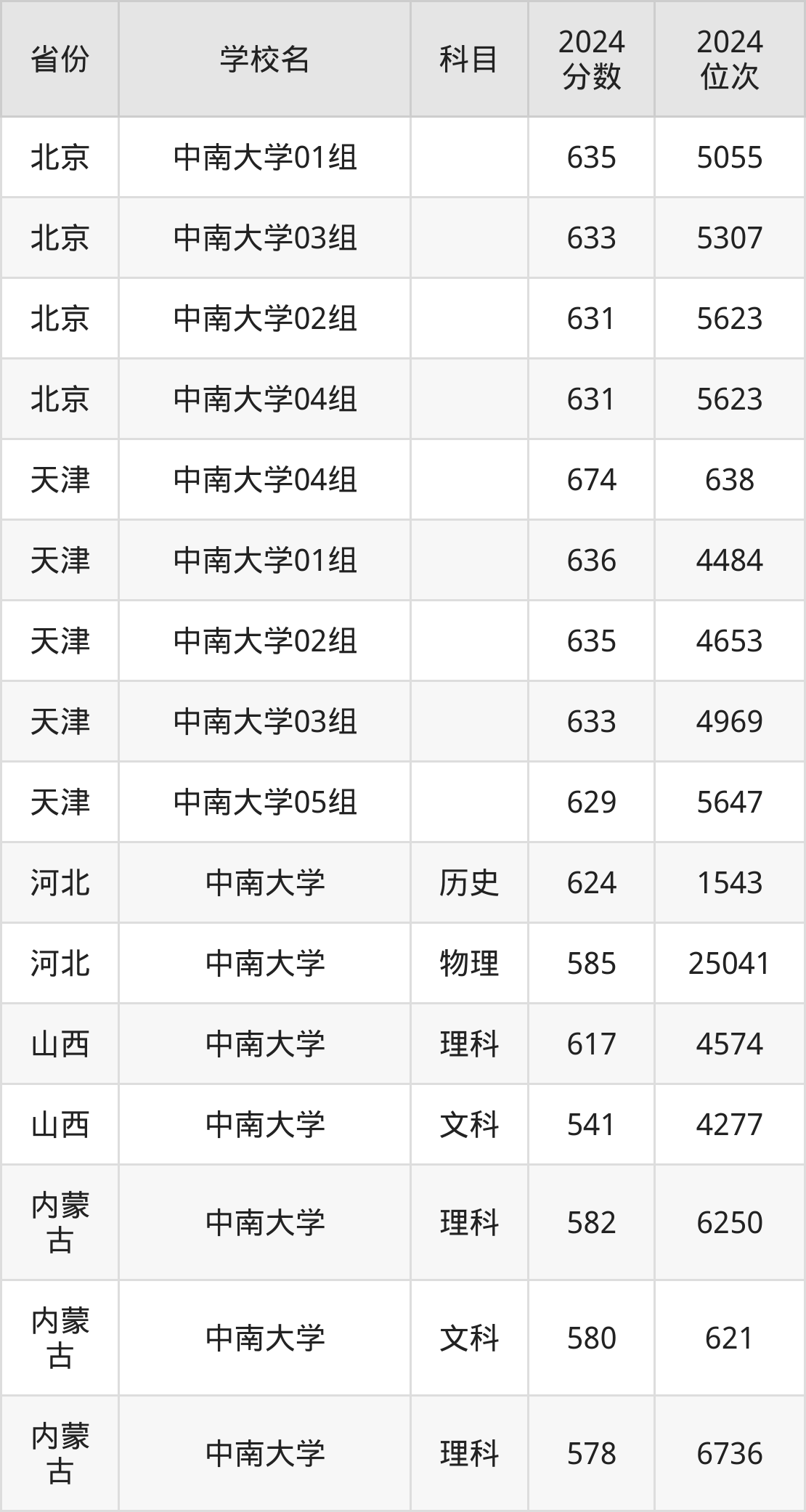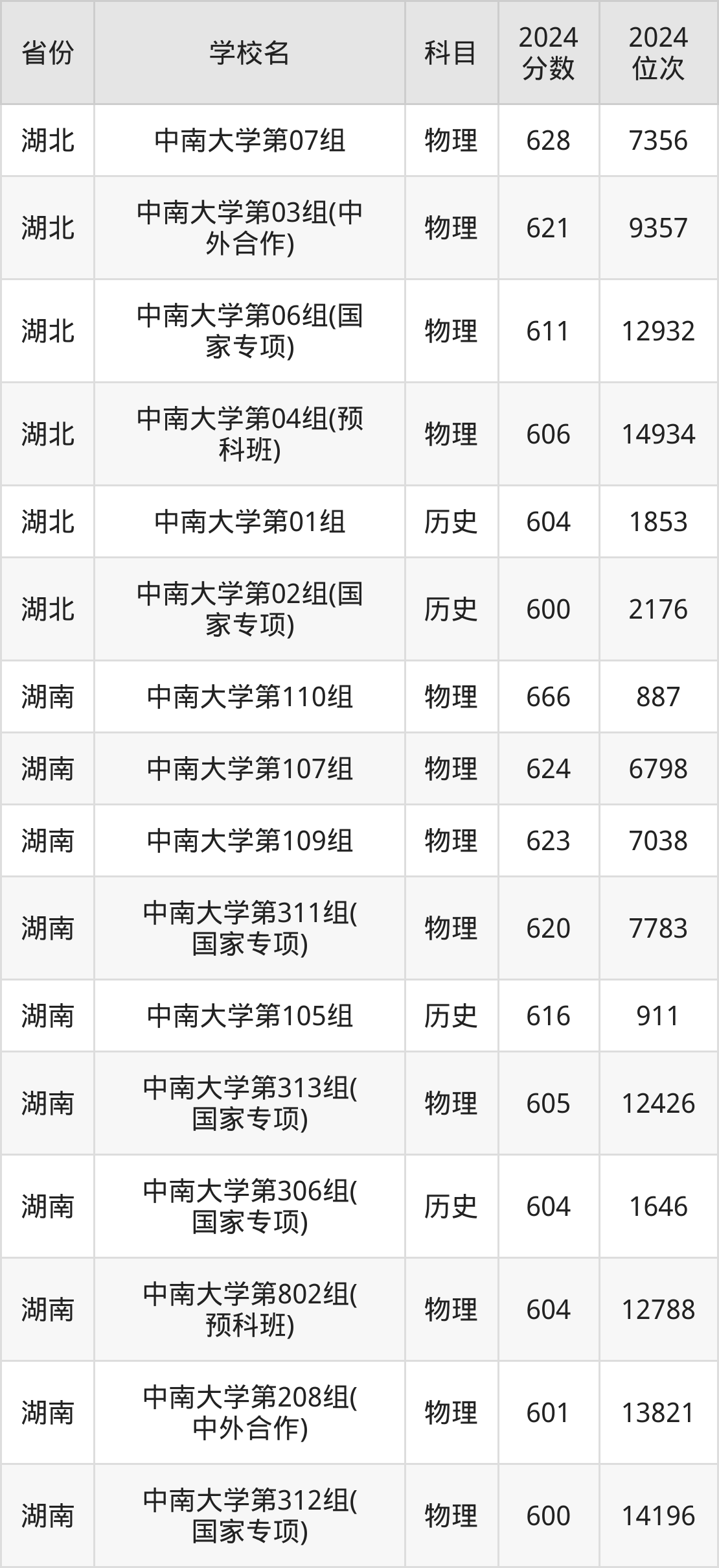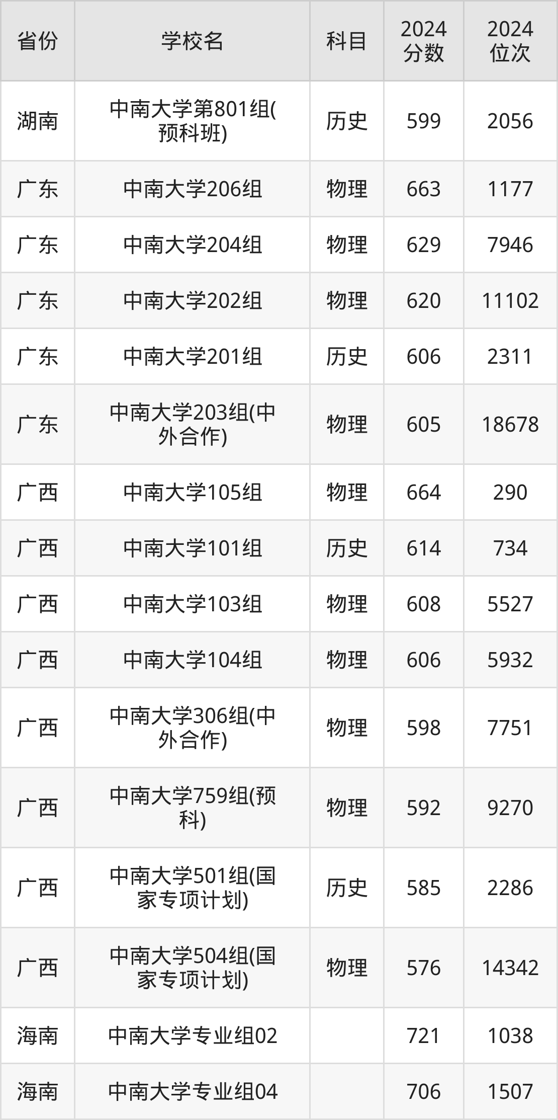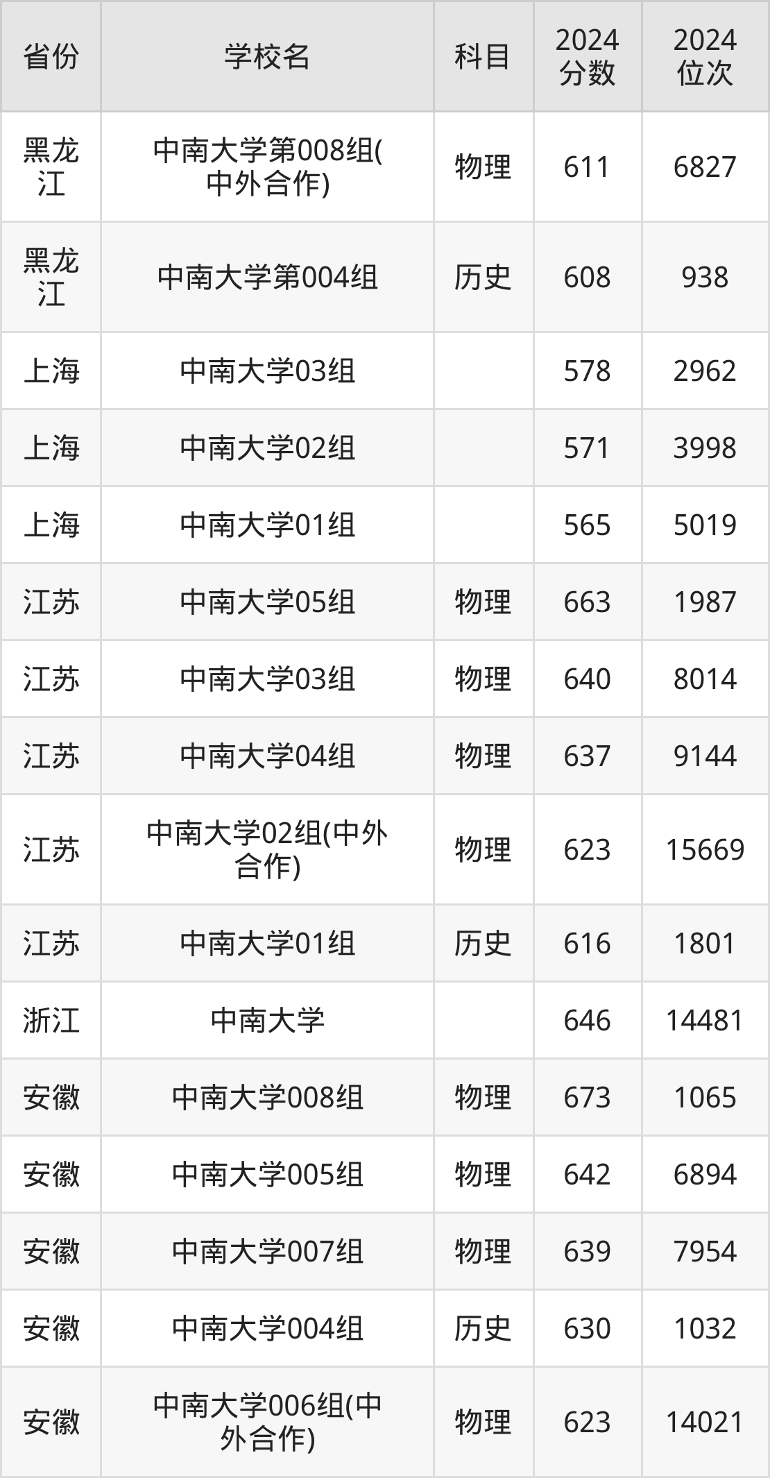 以2024年数据作为参考依据,整理湖南省内、省外考中南大学要多少分。
