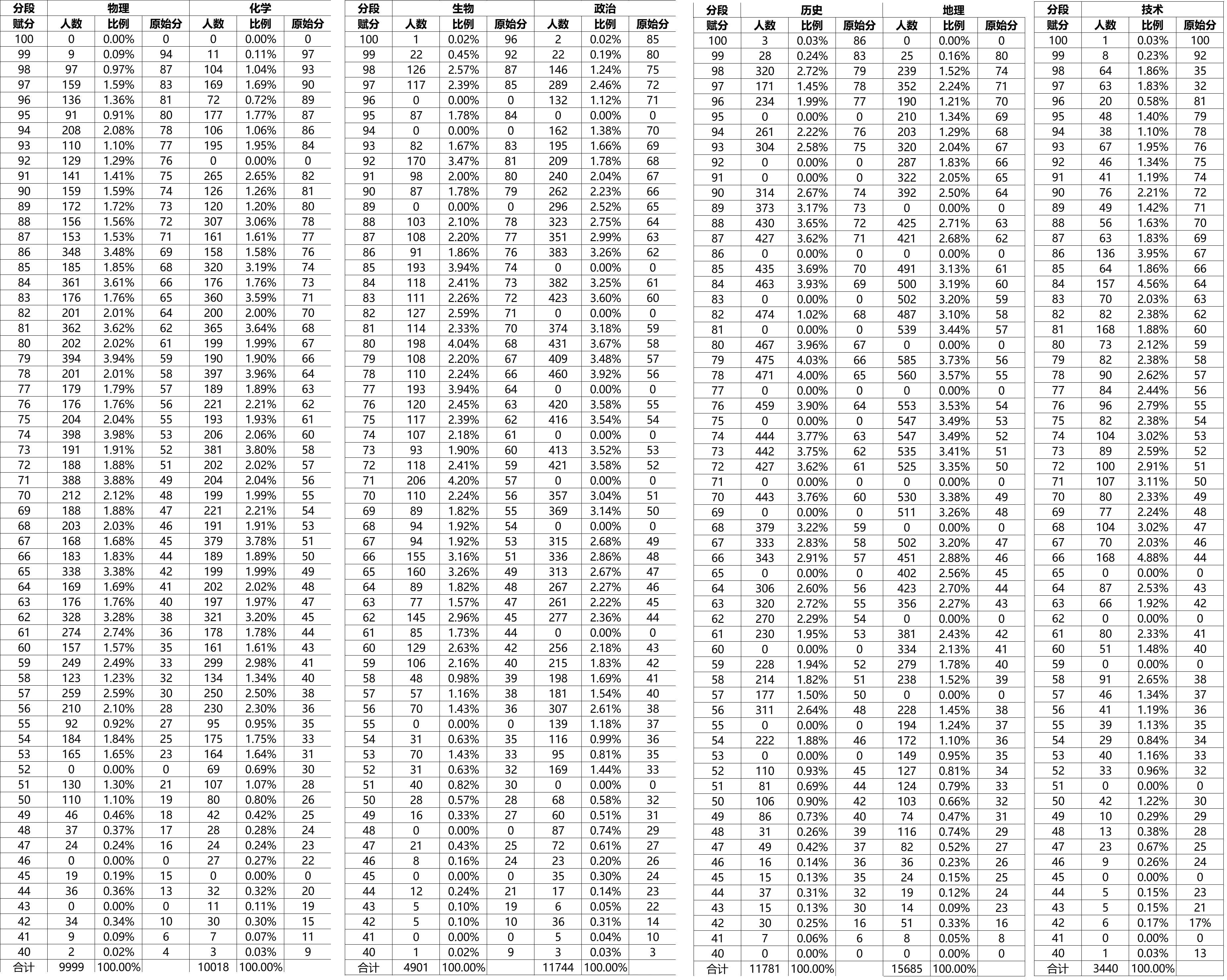 例如,物理学科满分100分人数为0,99分段有9人,占比0.09%;化学学科99分段有11人,占比0.11%。技术学科在90分以上段人数较多,如90分对应原始分66分,有314人,占比2.67%。