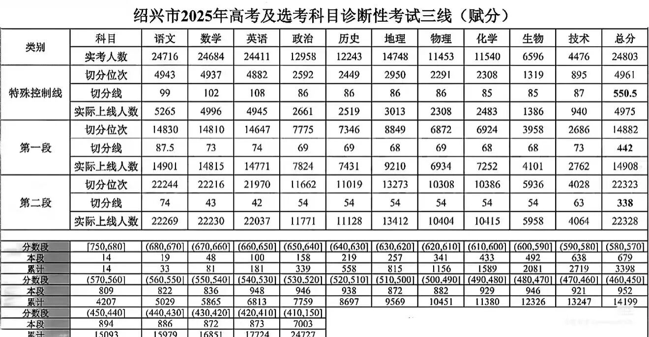 绍兴市2026届高三一模考试已公布划线结果:特控线为550.5分,一段线为442分,二段线为338分。总分实考人数为24803人,其中特殊控制线上线人数4975人,一段线上线人数14908人。
