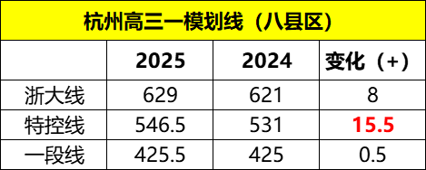 2026年杭州八县区一模划线较去年整体呈上升趋势。其中,浙大线为629分,较2025年的621分上涨8分;特控线为546.5分,较2025年的531分上涨15.5分;一段线为425.5分,较2025年的425分微涨0.5分。这一变化反映出本次考试难度可能略有降低或考生整体水平提升,尤其是特控线涨幅显著,需引起中等偏上学生重视。