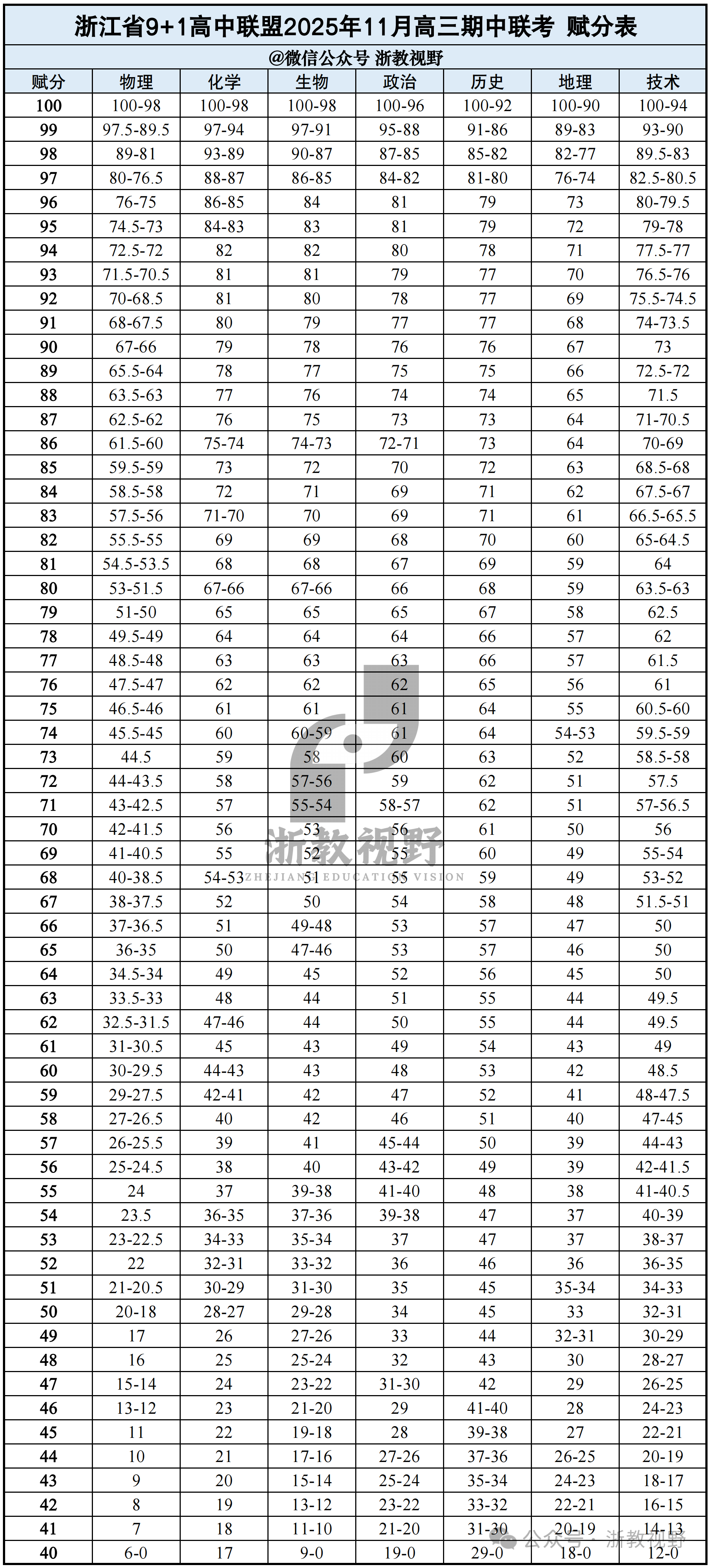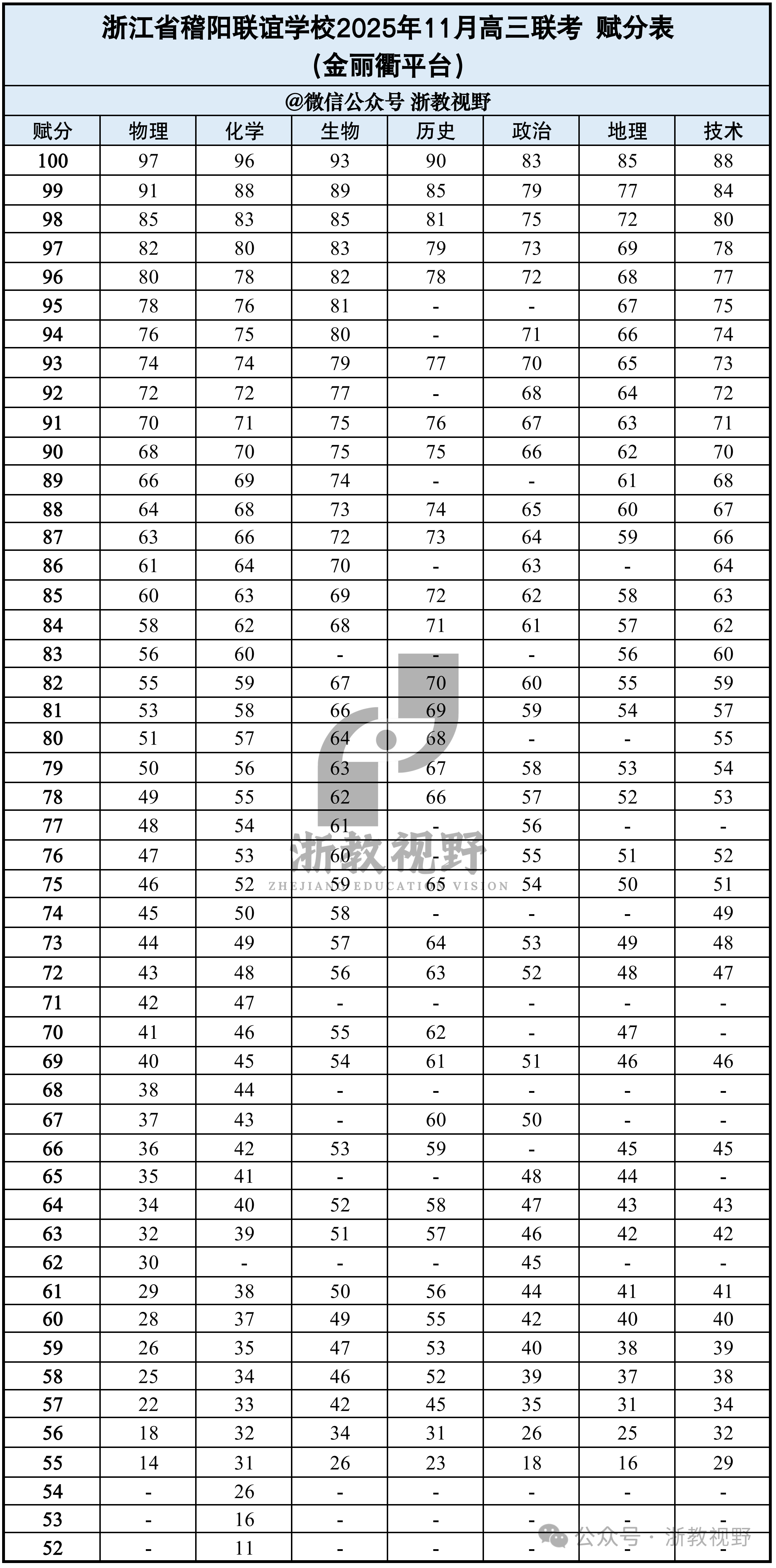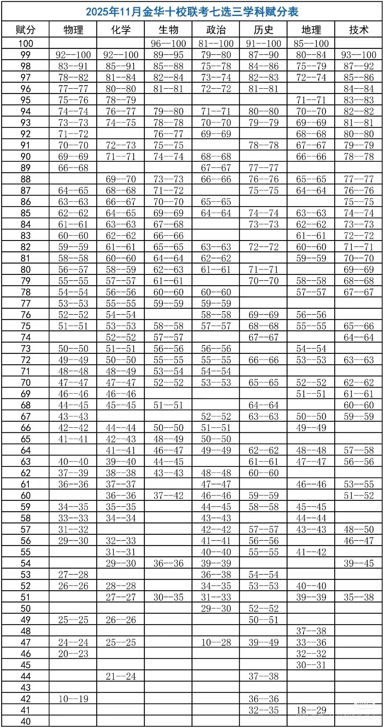 赋分方面,金华十校公布了详细的七选三科目赋分区间表。例如,生物科目原始分96–100分可赋至100分,政治81–100分赋100分,地理85–100分赋100分。技术科目93–100分可赋至99分。