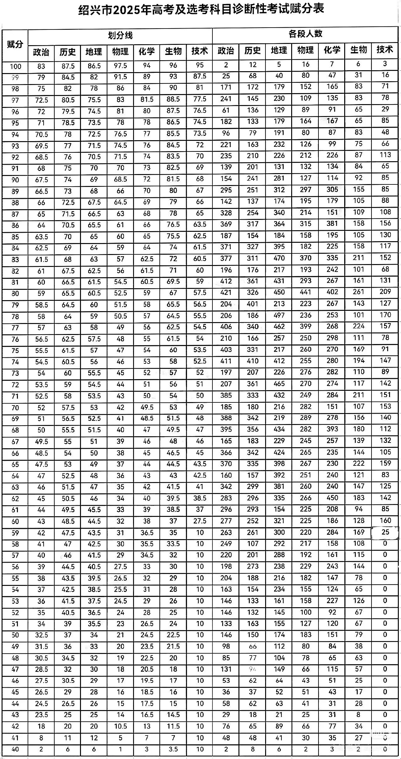 在赋分方面,绍兴公布了各科详细的原始分与赋分对应表。例如,政治赋分100分对应原始分83分,历史87.5分,地理86.5分,物理97.5分,化学94分,生物96分,技术95分。从各科赋分人数分布来看,物理、化学高分段人数较多,政治、历史中高分段竞争激烈。