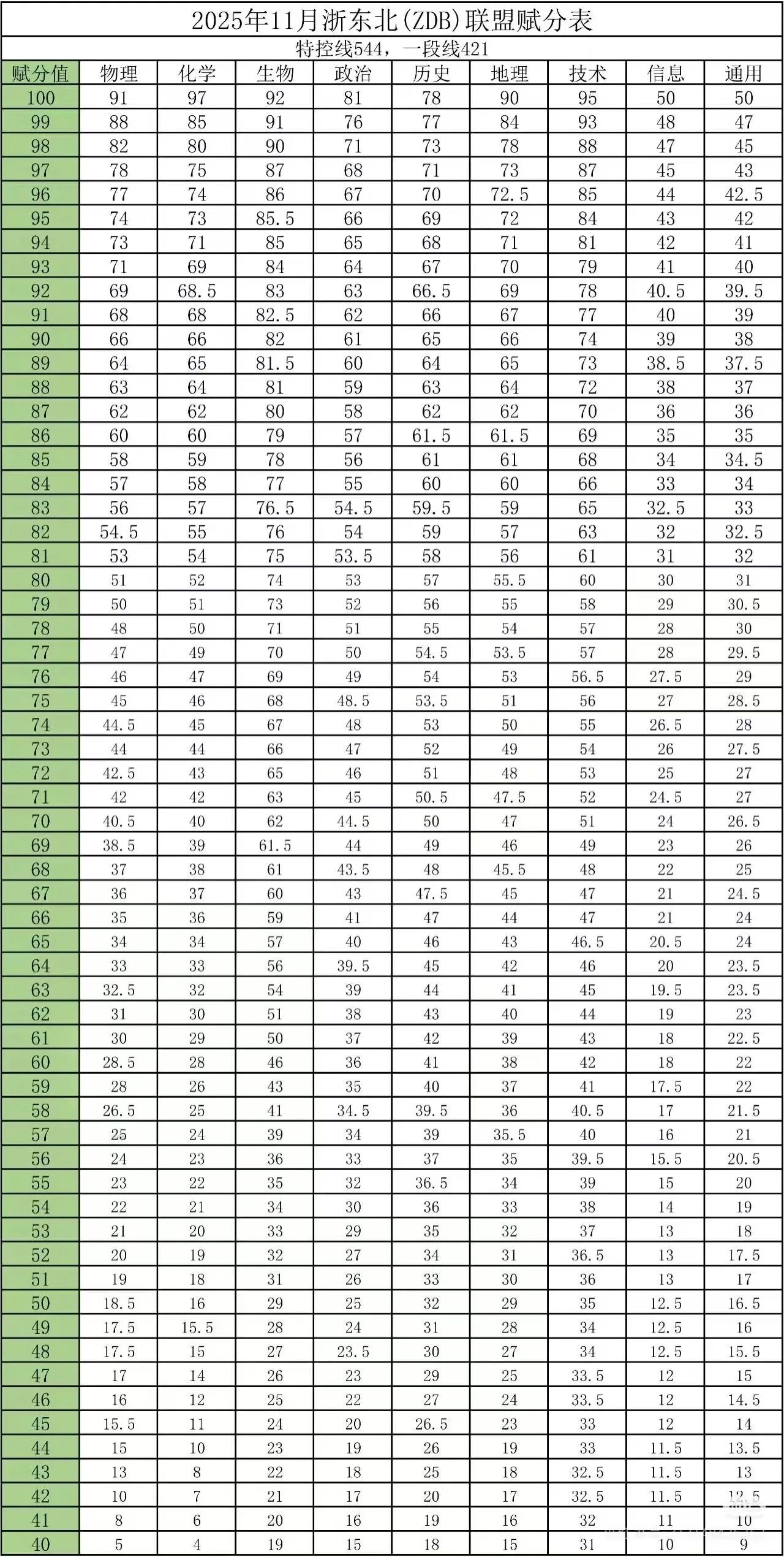 赋分方面,联盟公布了各科详细的赋分对应表。例如,物理91分可赋至100分,化学97分,生物92分,政治81分,历史78分,地理90分,技术95分。信息与通用技术科目满分各50分,赋分起点分别为50分。