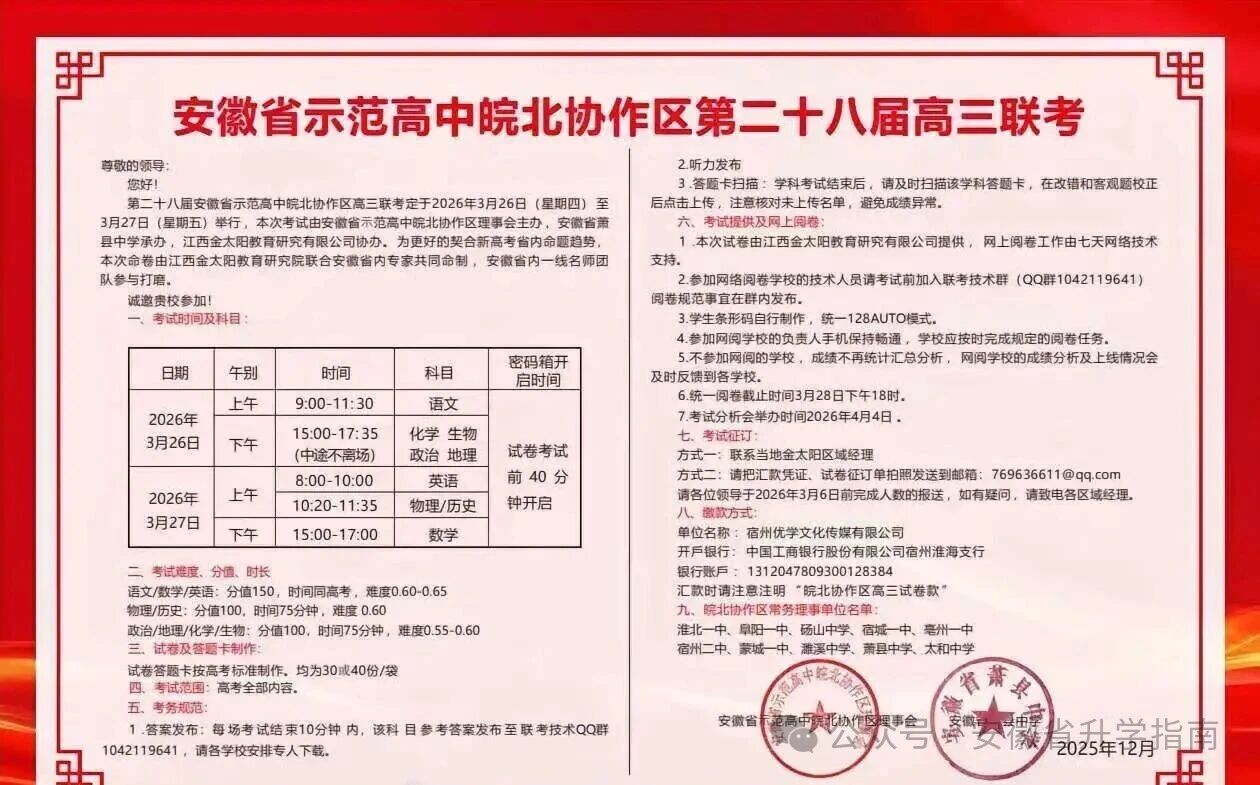 2026年安徽省示范高中皖北协作区第二十八届高三联考时间已正式确定,将于3月26日(星期四)至3月27日(星期五) 举行。本次考试由皖北协作区理事会主办、萧县中学承办,预计将有超过120所学校、近20万考生参与,是安徽省级模考中规模最大、参考价值最高的考试之一。