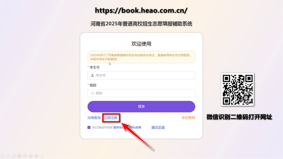 ① 登录网站,点击 “河南省 2025 年普通高校招生志愿辅助系统”;