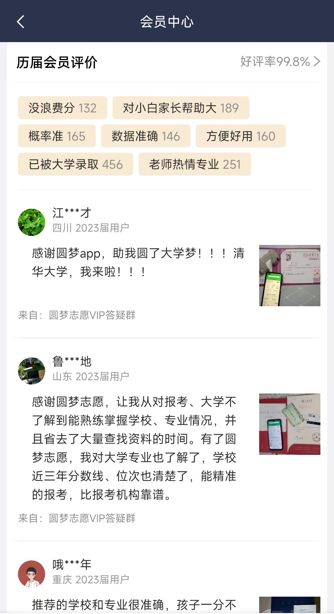 圆梦志愿虽说是一个免费志愿填报软件,不用付费就可以享受“输入分数测一测能上的大学及专业”这一功能,但它并不像其它软件一样数据混乱,圆梦志愿App的数据来源于官方,非源自网络收集,数据准确可信。使用过该款App的考生和家长好评如潮,历届家长、考生好评率高达99%,其专业度是考生和家长值得信赖的!