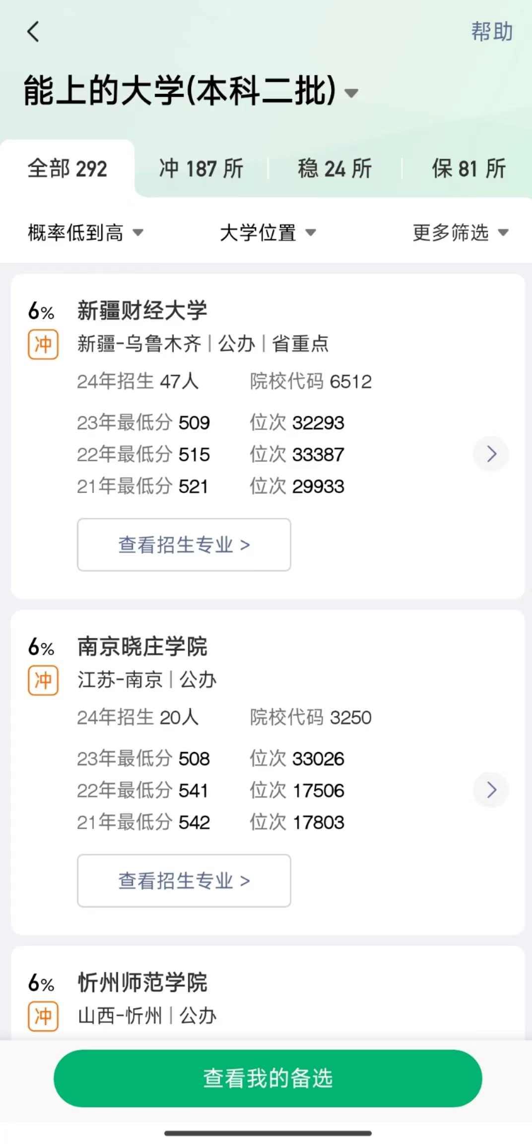 以2024年四川高考500分为例,可以看到能上的大学有292所,其中包含中央部署大学、省重点大学,院校均按照冲、稳、保梯度进行排序,并且还提供了详细的录取概率。