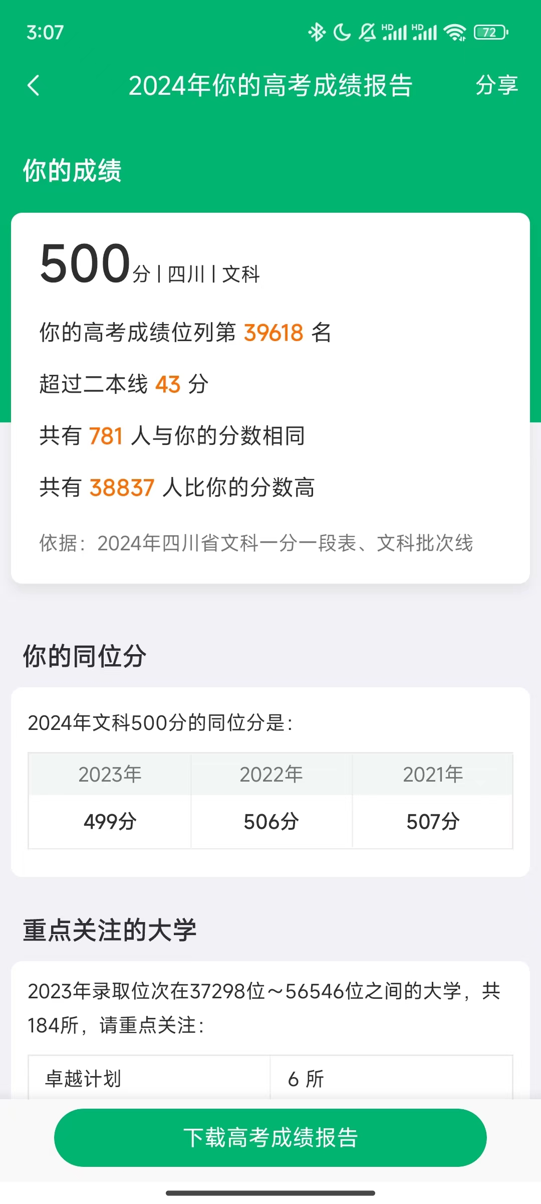 App能生成专属的高考成绩报告,报告中详细列出了近三年的同位分、重点关注的院校及专业、专业方向推荐等。考生可通过该报告全面了解自身情况,为志愿填报提供更加科学的依据。