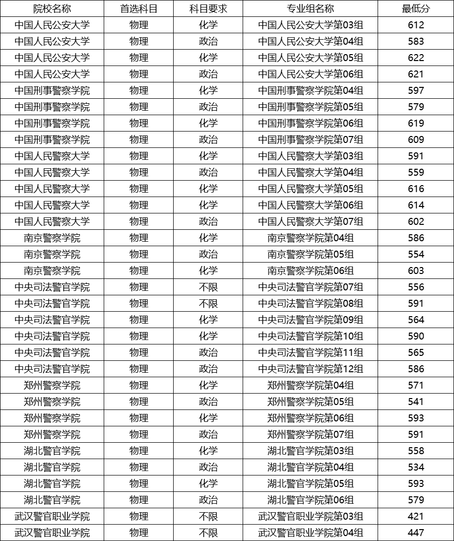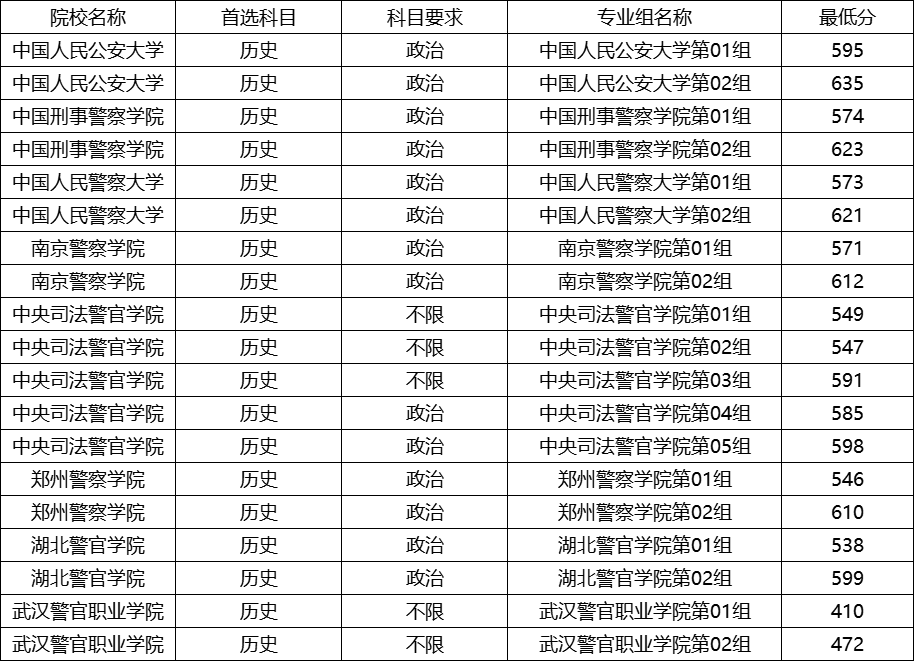 顶尖公安院校录取分数居高。中国人民公安大学两个专业组分数分别为595分和635分,其中第02组(政治)最低分635分,是历史类所有警校中的最高分。