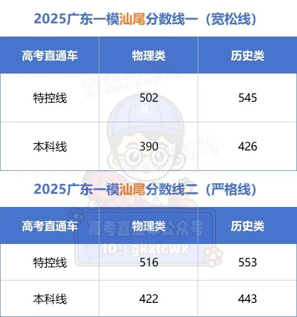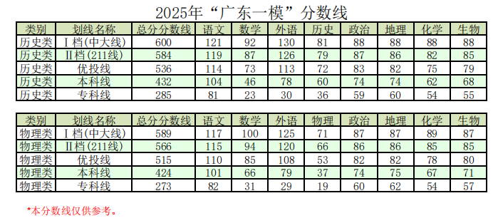 根据官方发布的划线信息,2025年广东一模对物理类和历史类考生分别划定了五个档次,从高到低依次为:I档(中上线,对标985/211层次)、II档(211线)、优段线(特控线,相当于往年高分优先投档线)、本科线、专科线。具体总分及各科分数线如下: