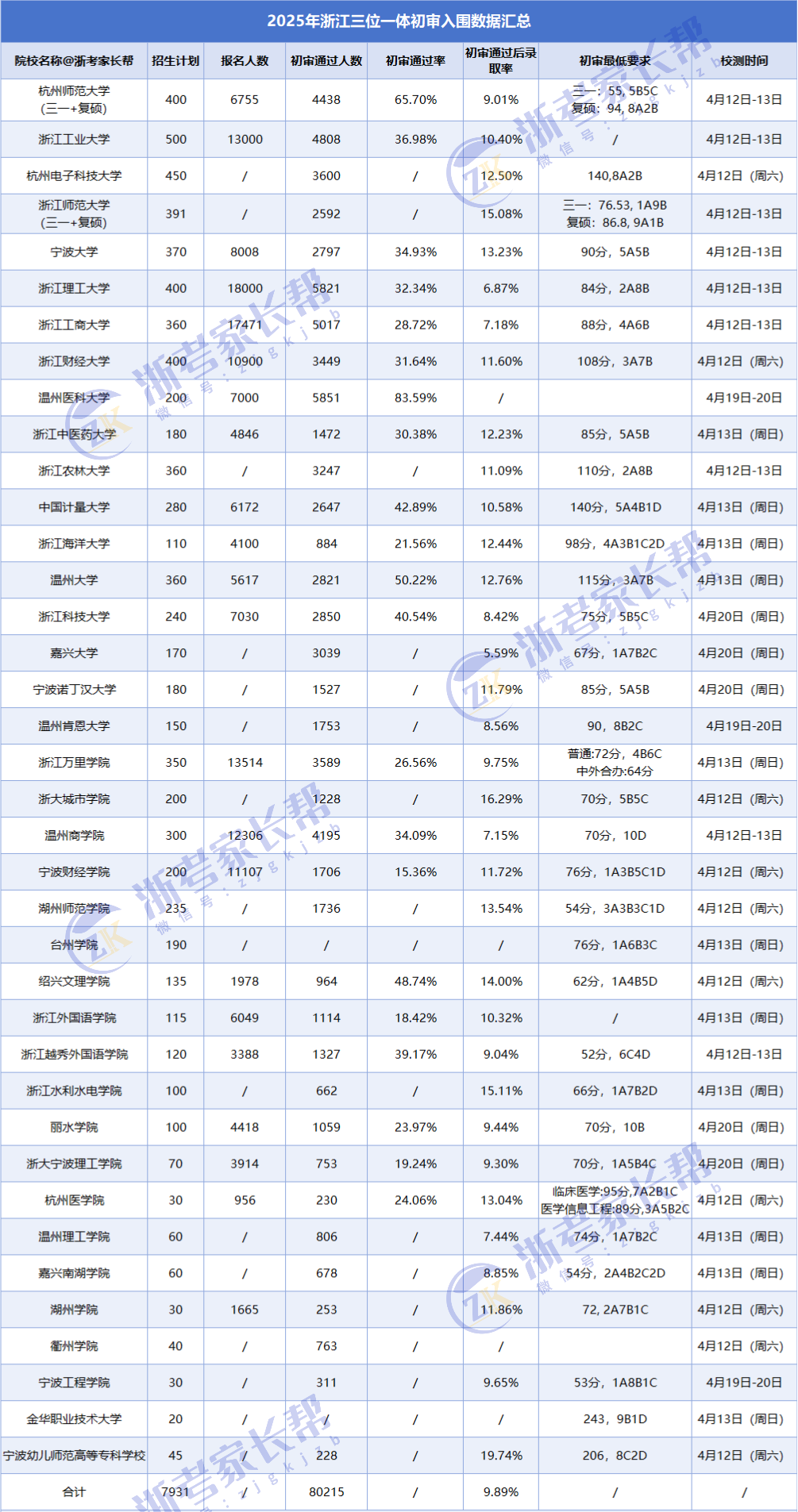 2025年,全省三位一体招生总计划约7931人,初审通过人数高达80215人,初审通过后录取率仅约9.89%。其中,温州医科大学初审通过率高达83.59%,杭州师范大学也达到65.7%,是初审门槛相对宽松的院校;而浙江理工大学、浙江工商大学等因报考人数众多,竞争异常激烈。