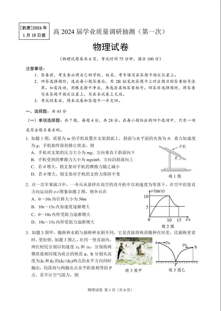 九龙坡一诊中,物理科目的考试时间为2024年1月17日(星期三)上午9:00-10:15。