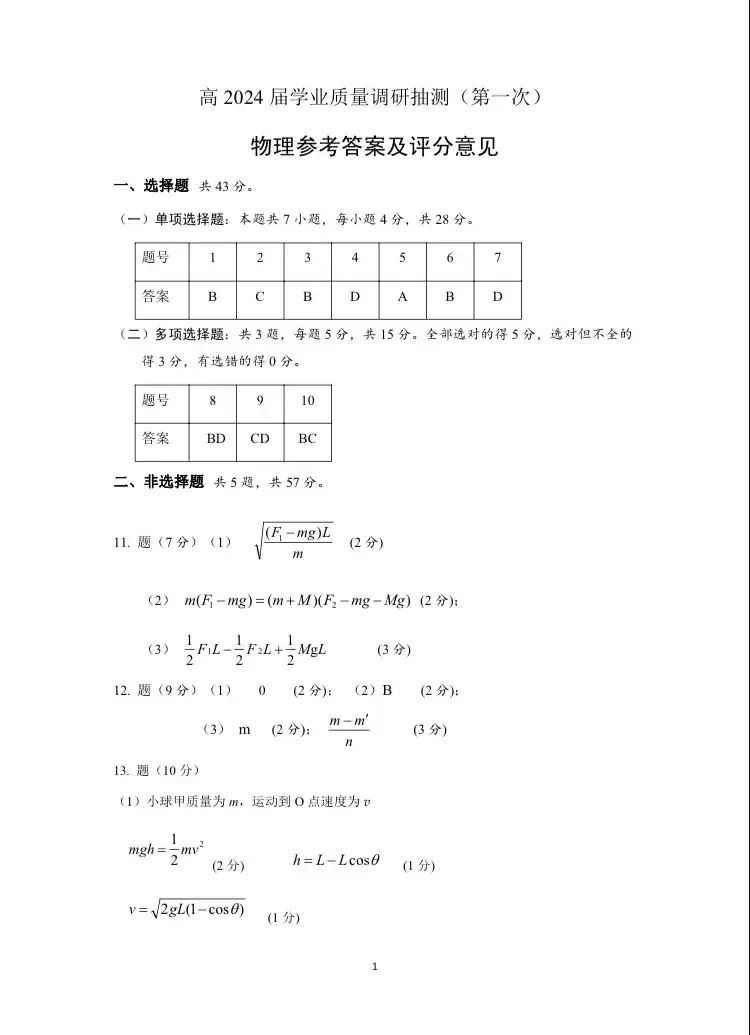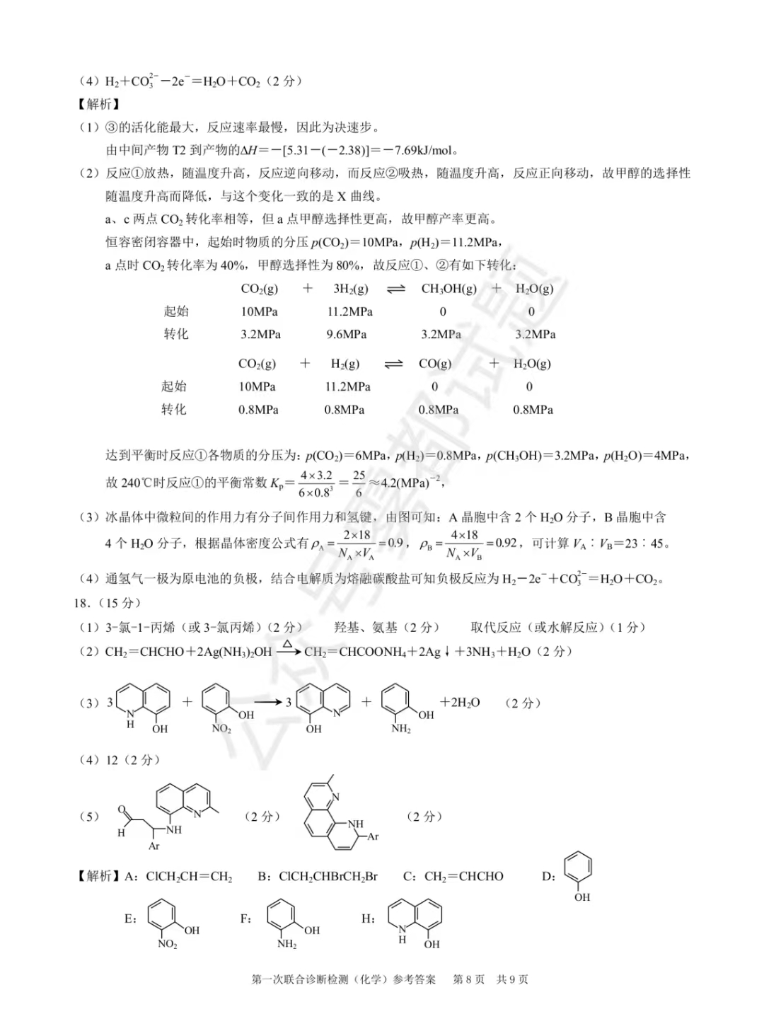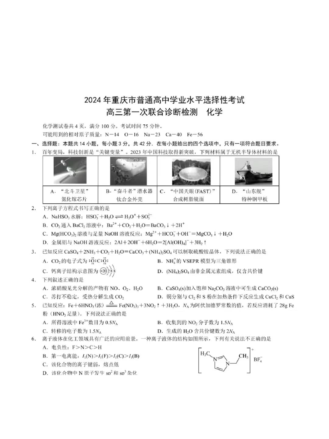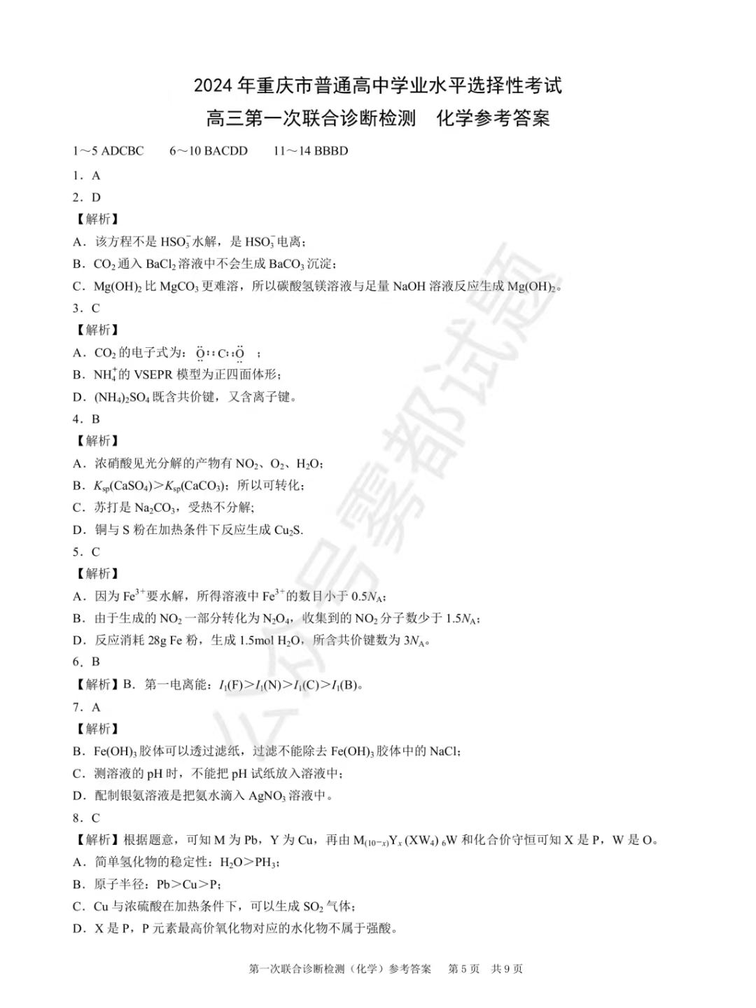二、重庆一诊2024物化生答案及试卷解析(康德卷)