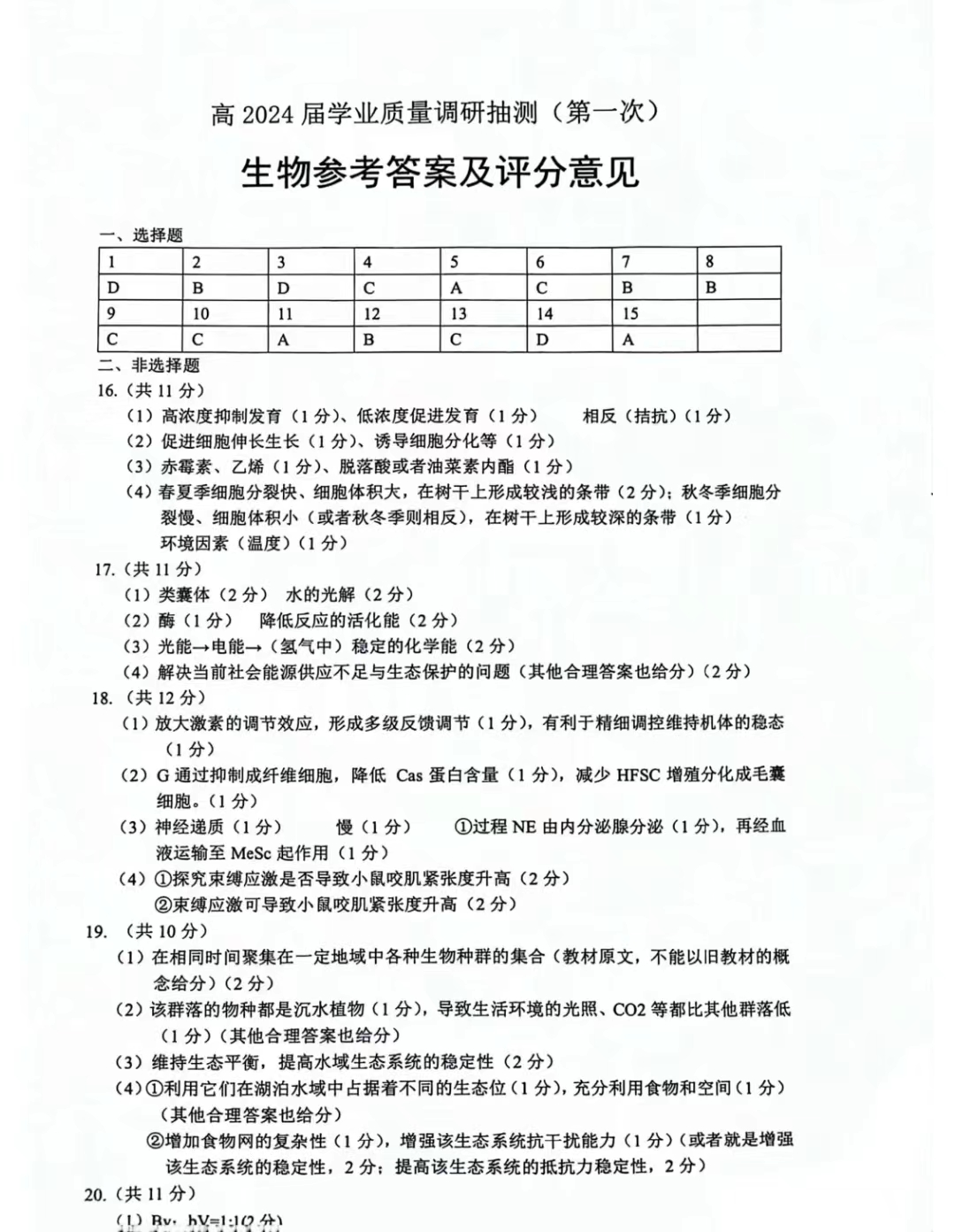 一、2024重庆一诊高三物化生试卷答案解析(九龙坡)