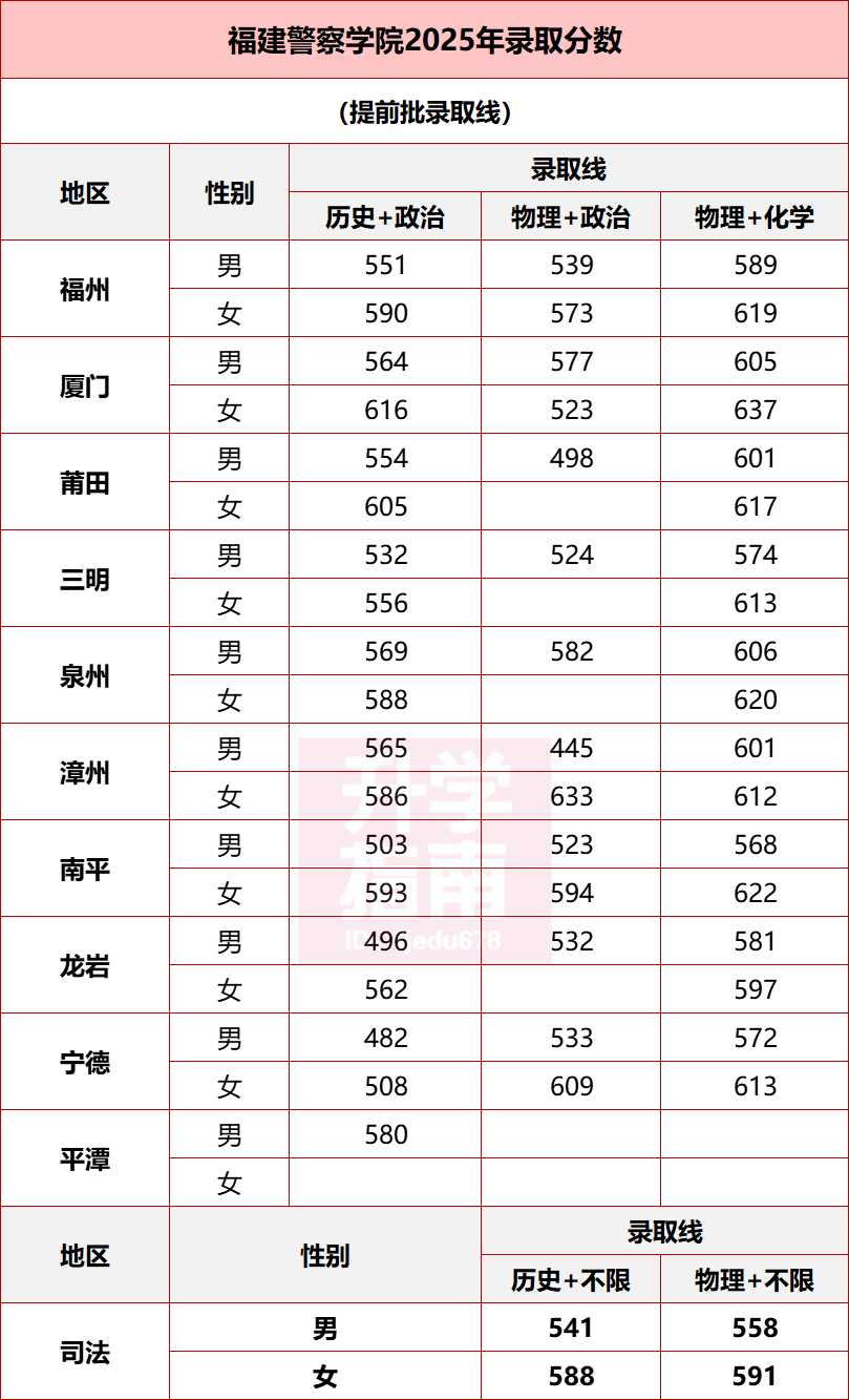 性别差异:女生录取线普遍远超男生,这是全国警校招生的普遍规律,在福建同样显著。