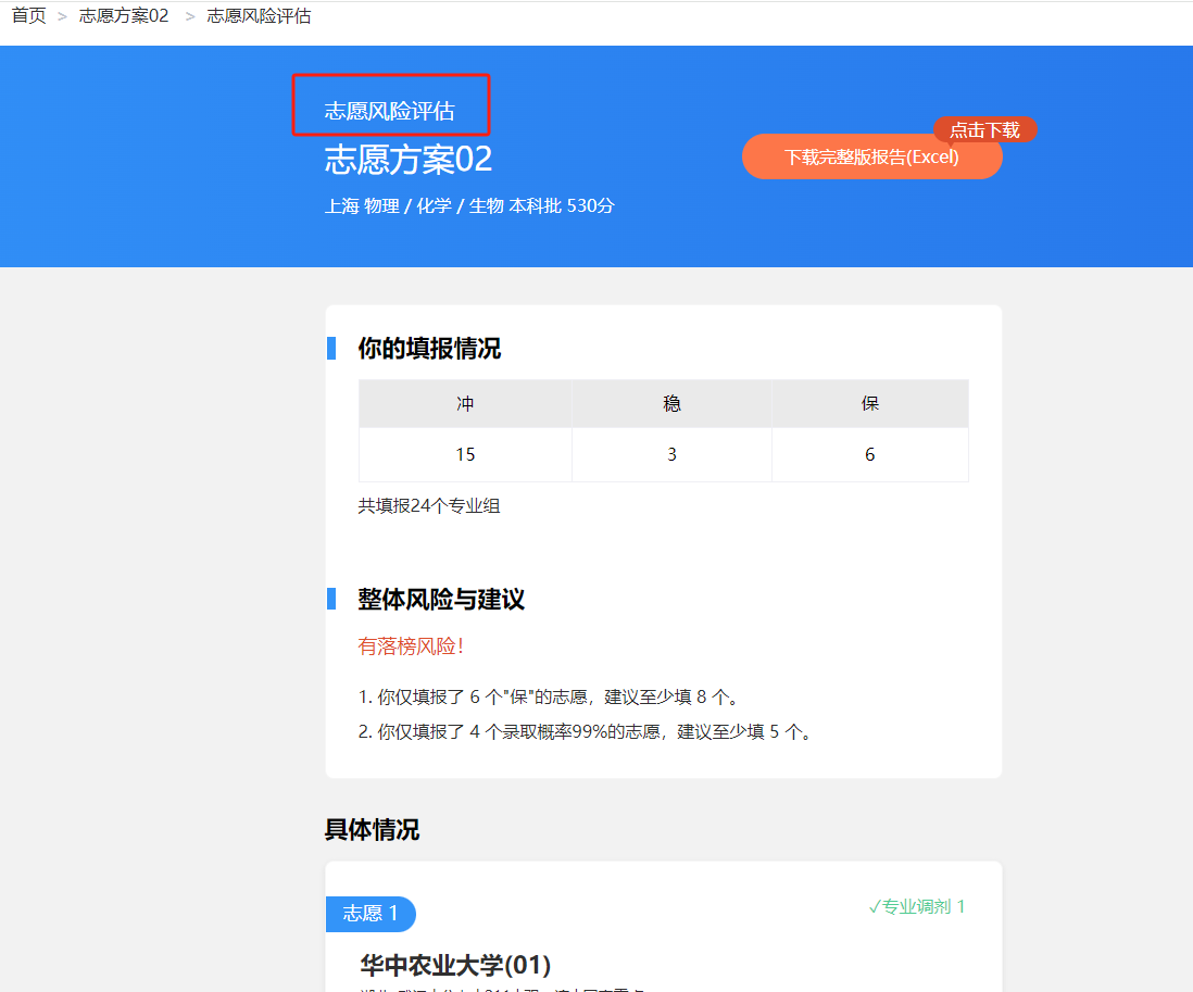 圆梦志愿APP利用先进的算法和冲稳保志愿梯度,对考生填报的志愿进行风险评估,给出录取概率,以及高考志愿改进建议,帮助考生和家长科学决策。这项志愿评估功能,不仅能够让考生及家长深入地了解志愿填报的流程和规则,更能够避免一些常见的错误和陷阱。