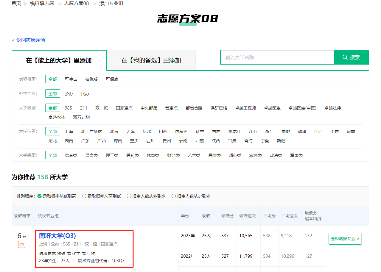 通过模拟填报功能,考生可以提前体验志愿填报的流程,了解不同志愿组合的效果,为正式填报做好充分准备。圆梦志愿支持考生从能上的大学中备选生成高考志愿,而且还支持考生自主填报,填报时还会显示大学的相关信息,例如:大学所在城市、层次、专业及选科要求、招生人数、往年录取分数位次情况等。