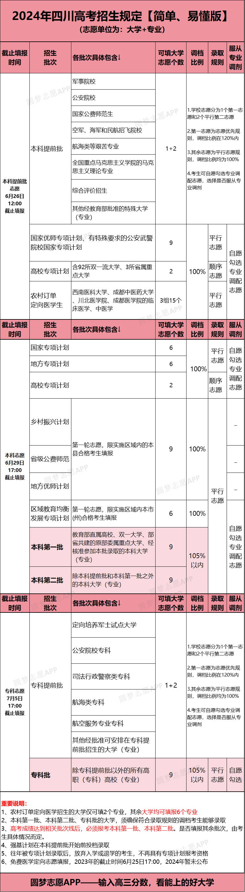 圆梦小灯塔为2024年四川高考生整理汇总了:简单、易懂版的招生规定,具体如下图。其中,2024年四川高考第一批本科可以填9个志愿,每个志愿可以填6个专业。